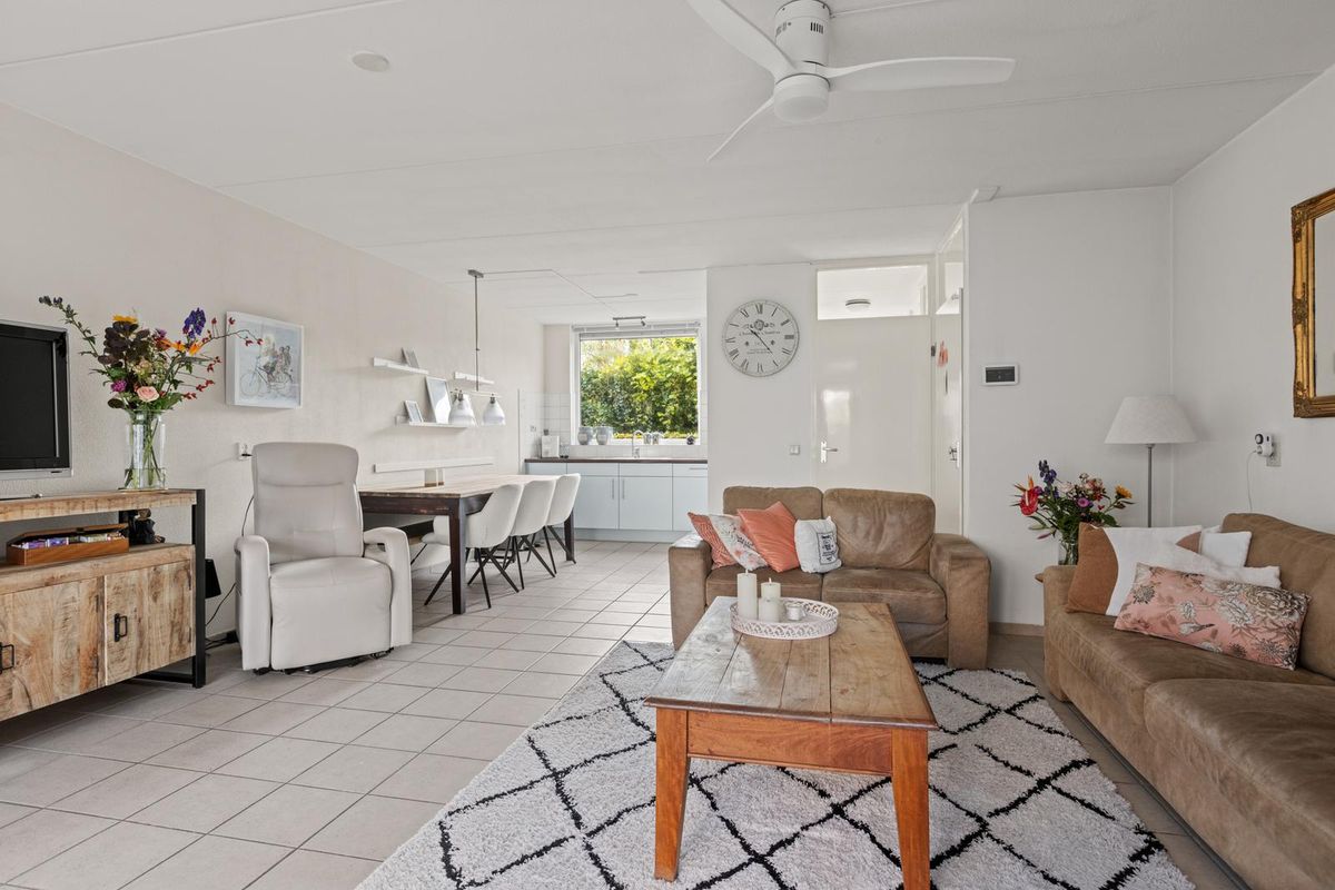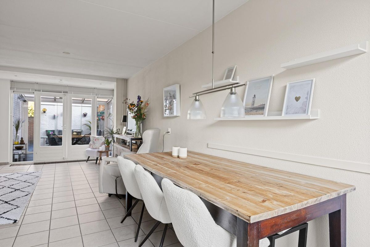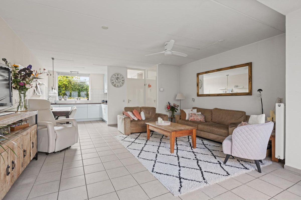 Je stapt binnen via de hal en loopt door naar de ruime woonkamer, waar het direct voelt als thuiskomen. De zithoek biedt volop ruimte voor een comfortabele bank. Aan de andere kant van de woonkamer is plek voor een gezellige eethoek — perfect voor lange avonden tafelen met familie of vrienden.