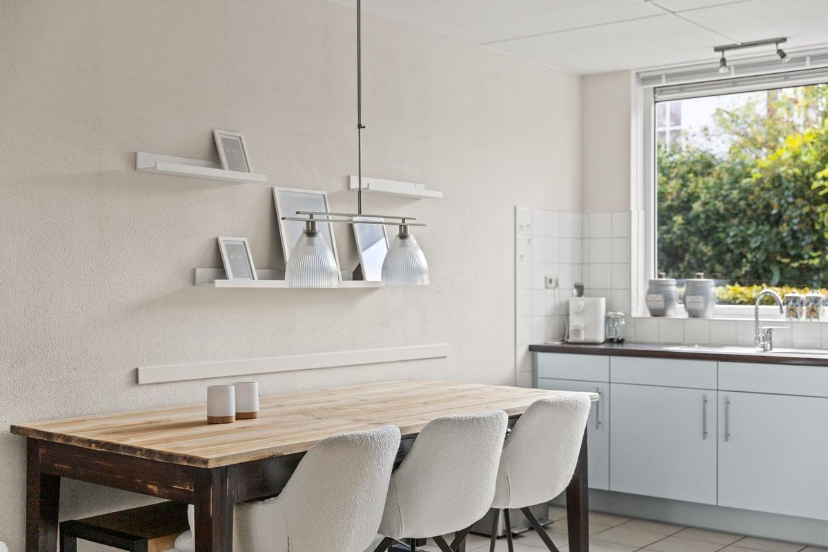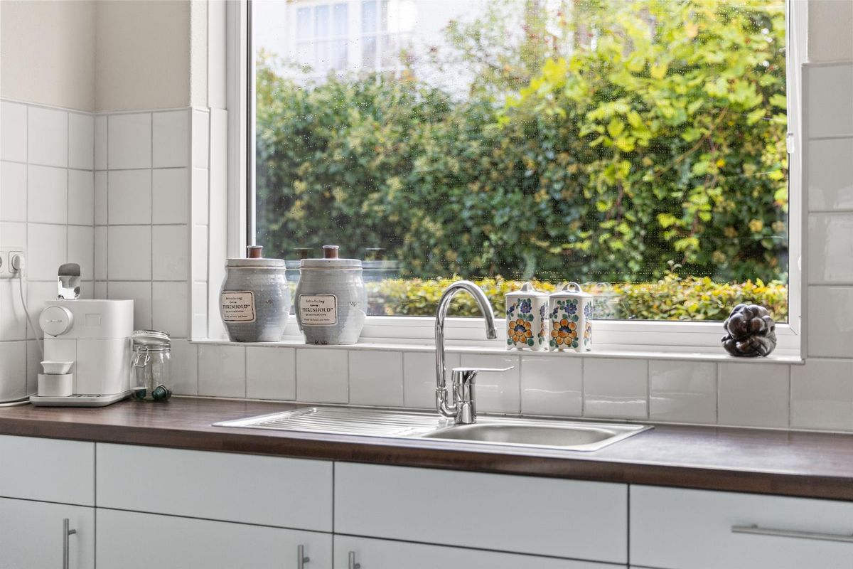 Onder de trap bevindt zich een handige trapkast voor extra opbergruimte en via de bijkeuken heb je toegang tot praktische voorzieningen zoals de wasmachine, droger en extra kastruimte. In de bijkeuken vind je bovendien de oven, magnetron en een ruime dubbeldeurs koelkast, waardoor de keuken zelf optimaal open en overzichtelijk blijft.