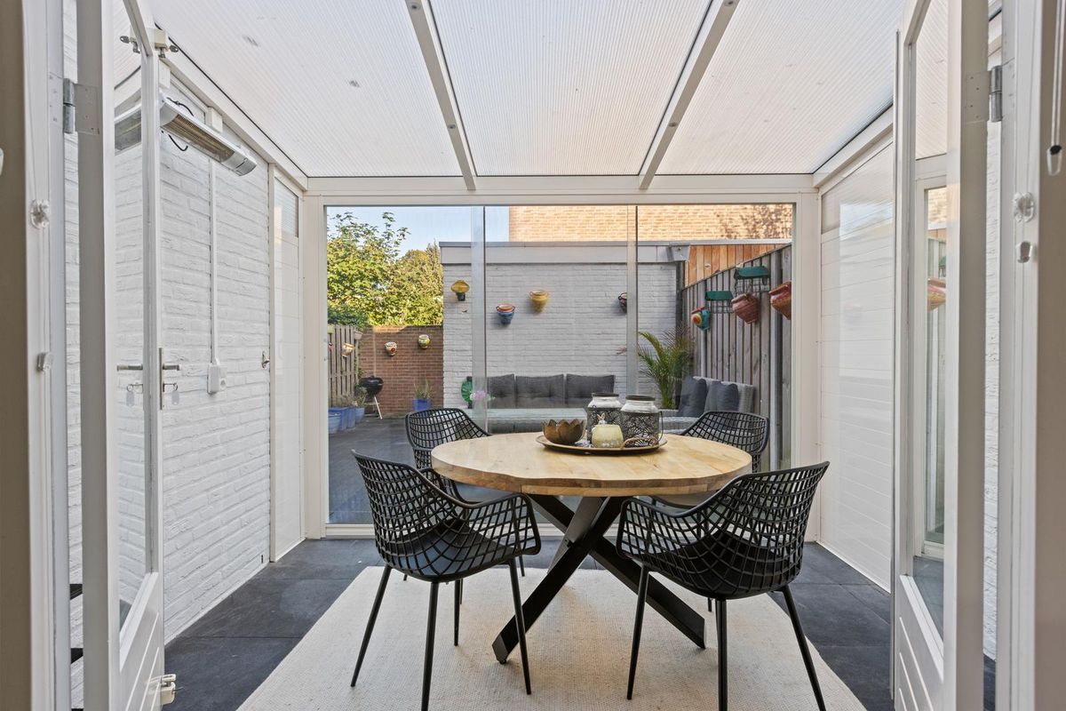 Vanuit de bijkeuken loop je door naar de serre: een heerlijke extra ruimte waar je het hele jaar door kunt genieten. Op zonnige dagen schuif je de glazen pui open en vloeien binnen en buiten naadloos in elkaar over. De serre is tevens bereikbaar via de openslaande deuren in de woonkamer en is voorzien van hangende heaters met afstandsbediening, zodat je ook in de koelere maanden comfortabel buiten kunt zitten. Dankzij de nis in de tuin zit je hier bovendien al in het vroege voorjaar heerlijk beschut en windvrij.