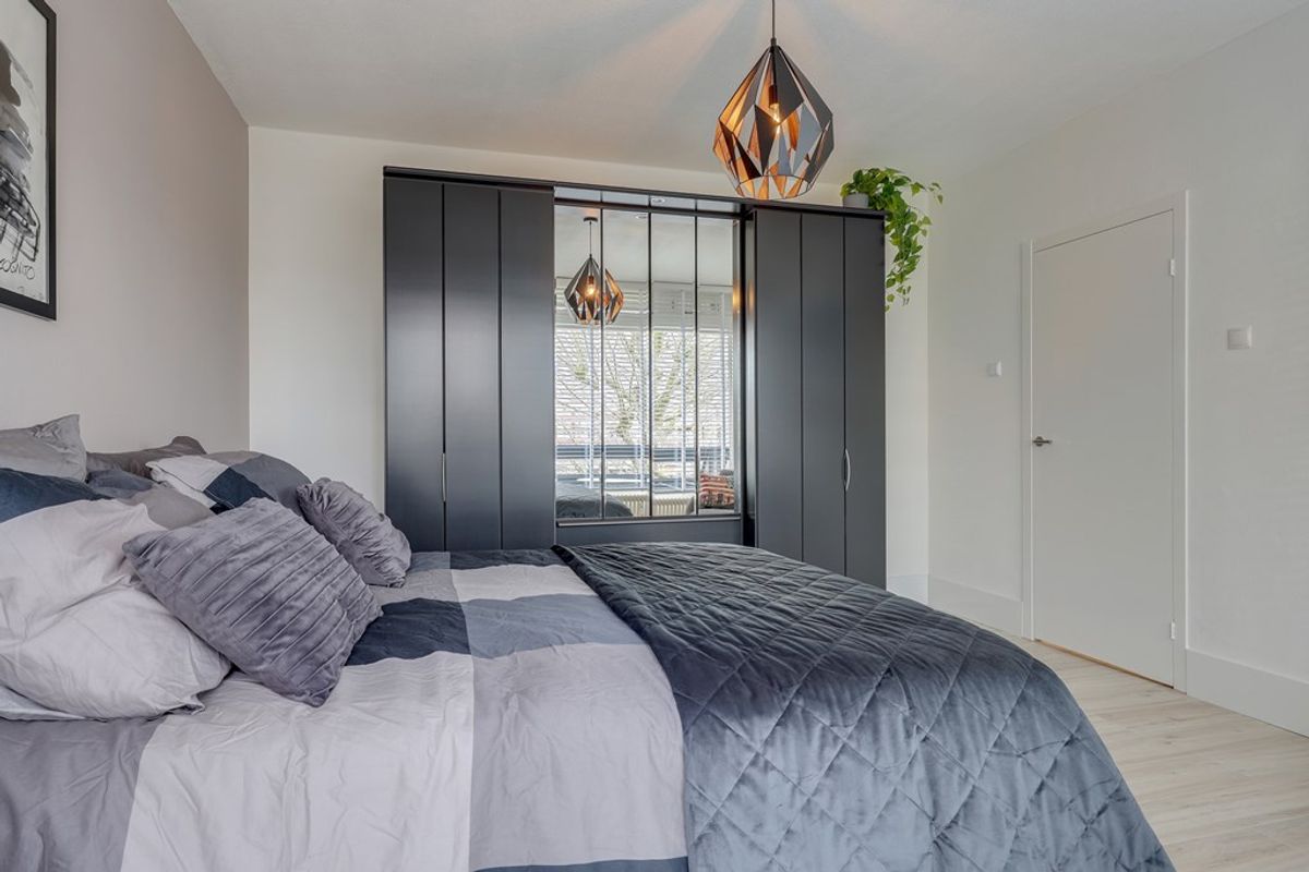 Vanuit de woonkamer heeft u toegang tot deze luxe slaapkamer die ook voorzien is van laminaat en een rolluik.