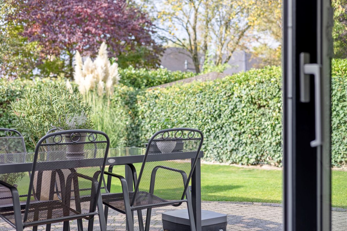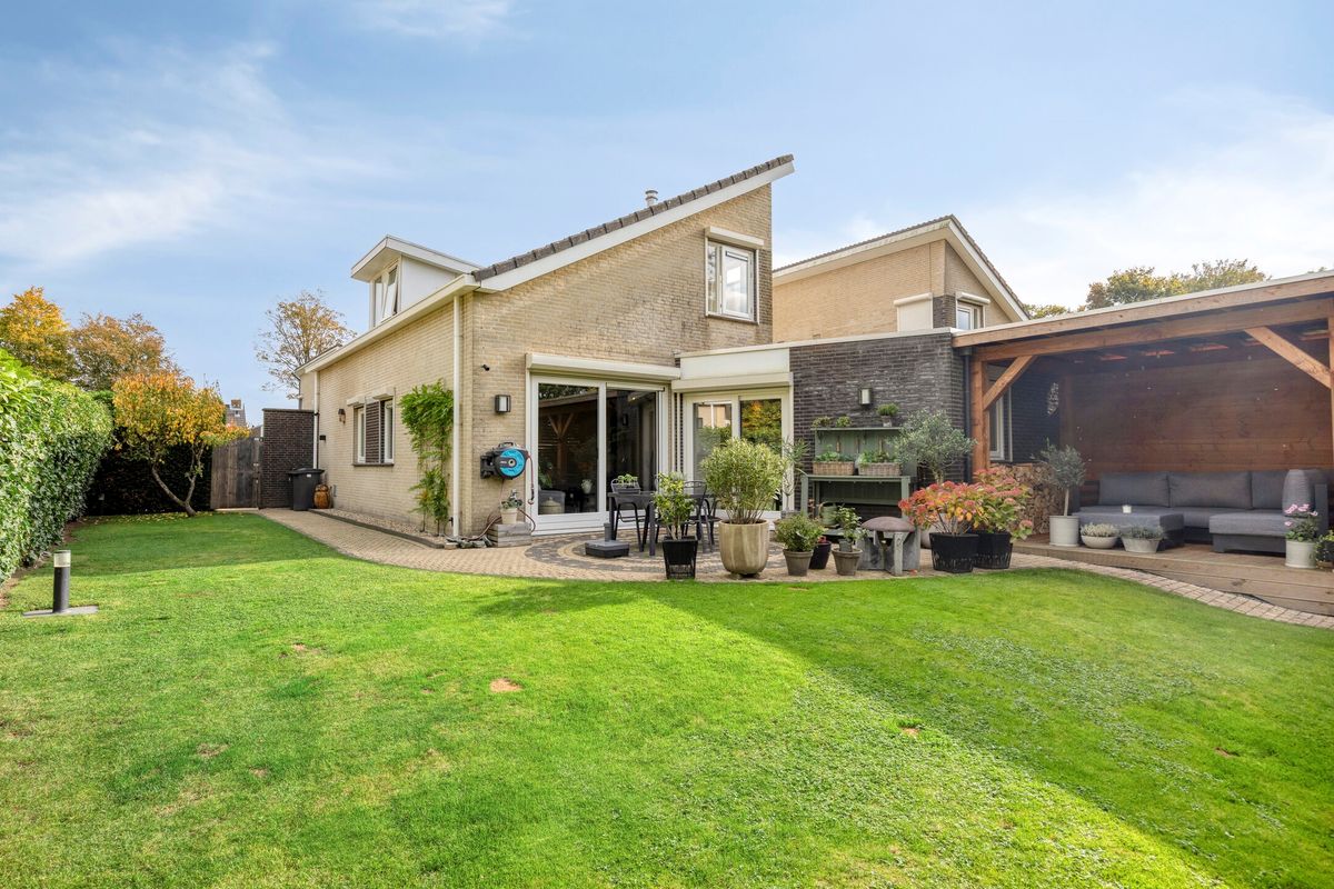 De achtertuin ligt lekker beschut en biedt volop privacy dankzij het ontbreken van directe bebouwing aan de achterzijde. Direct achter de woning is het terras, vanwaar je lekker uitkijkt over je tuin; licht glooiend gazon en mooie plantenborders. Heerlijk vertoeven is het onder de royale - en heel fraai gemaakte - overkapping, een superfijn plekje en een ideale plek om te ontspannen of gezellig te barbecueën met familie en vrienden. Puur genieten van de rust, het groen en de ruimte in uw eigen tuin.