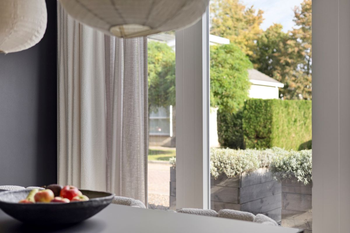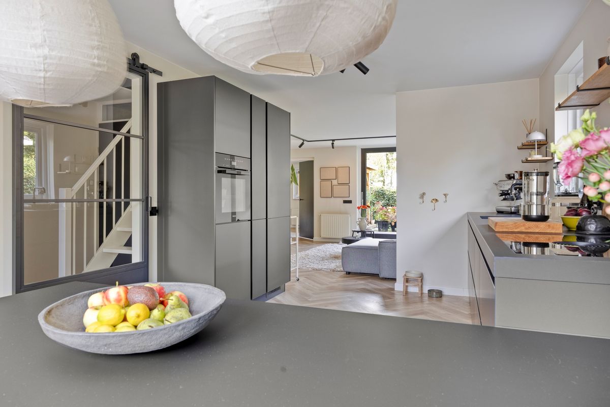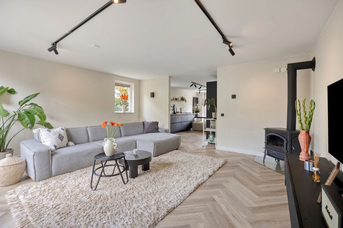 Bij binnenkomst komt u via de hal, met de deur naar de garage, de trapopgang en het toilet, in de sfeervolle leefkeuken. En wat een eyecatcher is dat! Zo goed als nieuw (2022), van het solide merk Tieleman, uitgevoerd in modern mat carbonzwart en voorzien van alle denkbare inbouwapparatuur als een vaatwasser, een koelkast, een vrieskast, een oven en een Quooker. Er wordt gekookt op een inductiekookplaat van Bora, met geïntegreerde afzuiging. De grote raampartij zorgt voor veel lichtinval, en de gezellige zithoek maakt dit tot de perfecte plek om samen te ontbijten of ’s avonds met een glas wijn de dag door te nemen. Aansluitend is de woonkamer. Deze is tuingericht en heeft een schuifpui naar het terras, waardoor binnen en buiten mooi in elkaar overlopen. De strakke visgraat pvc-vloer, de glad gestuukte wanden en de houtkachel maken dit tot een bijzonder prettige leefruimte; licht, warm, eigentijds en uitnodigend.