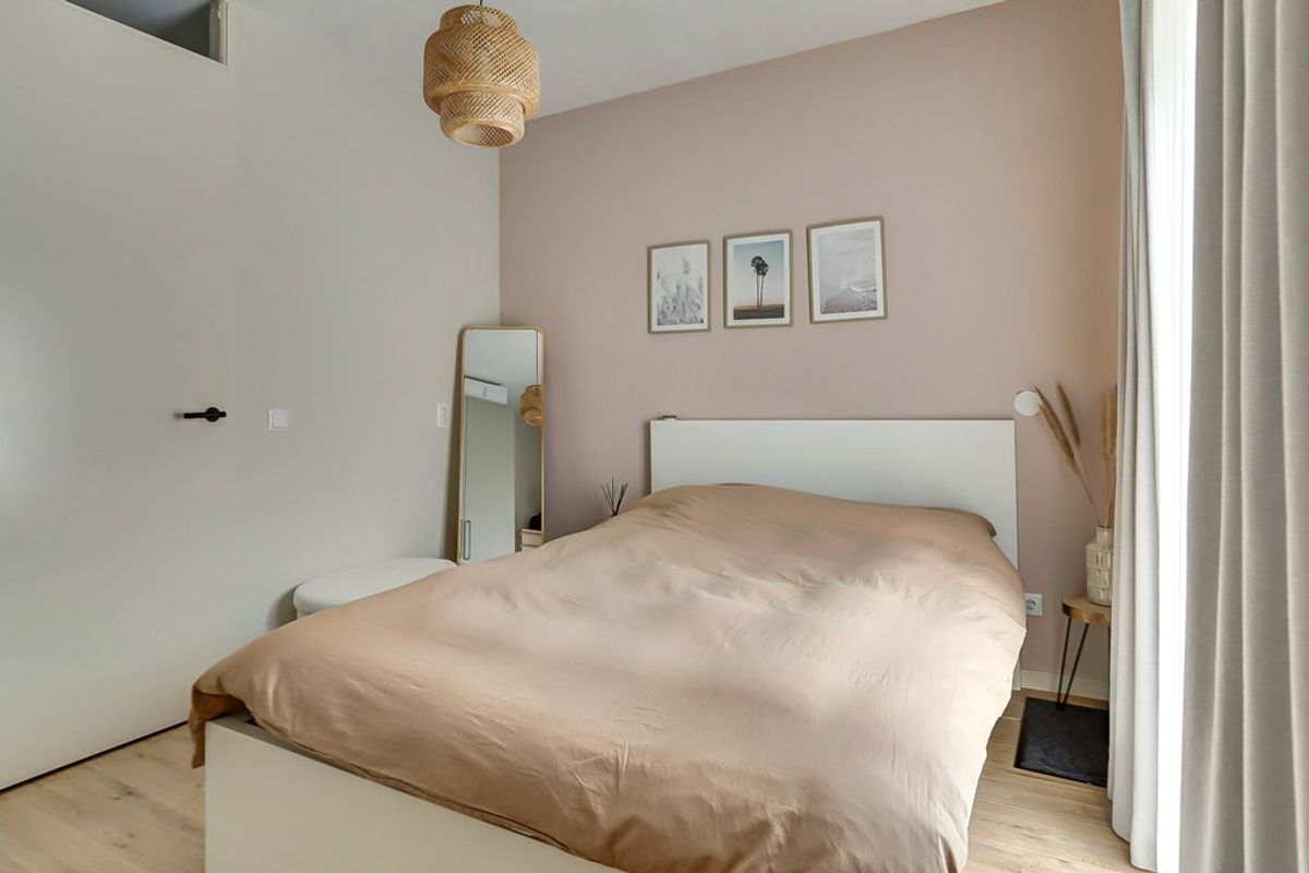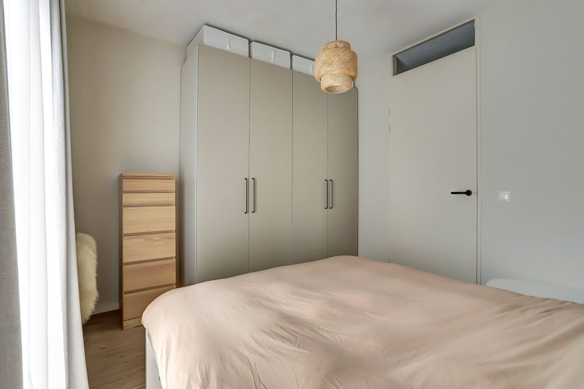 De lichte slaapkamer beschikt over een groot raam en openslaande deuren, wat zorgt voor een prettige, open sfeer. De kamer biedt voldoende ruimte voor een tweepersoonsbed en een kledingkast.