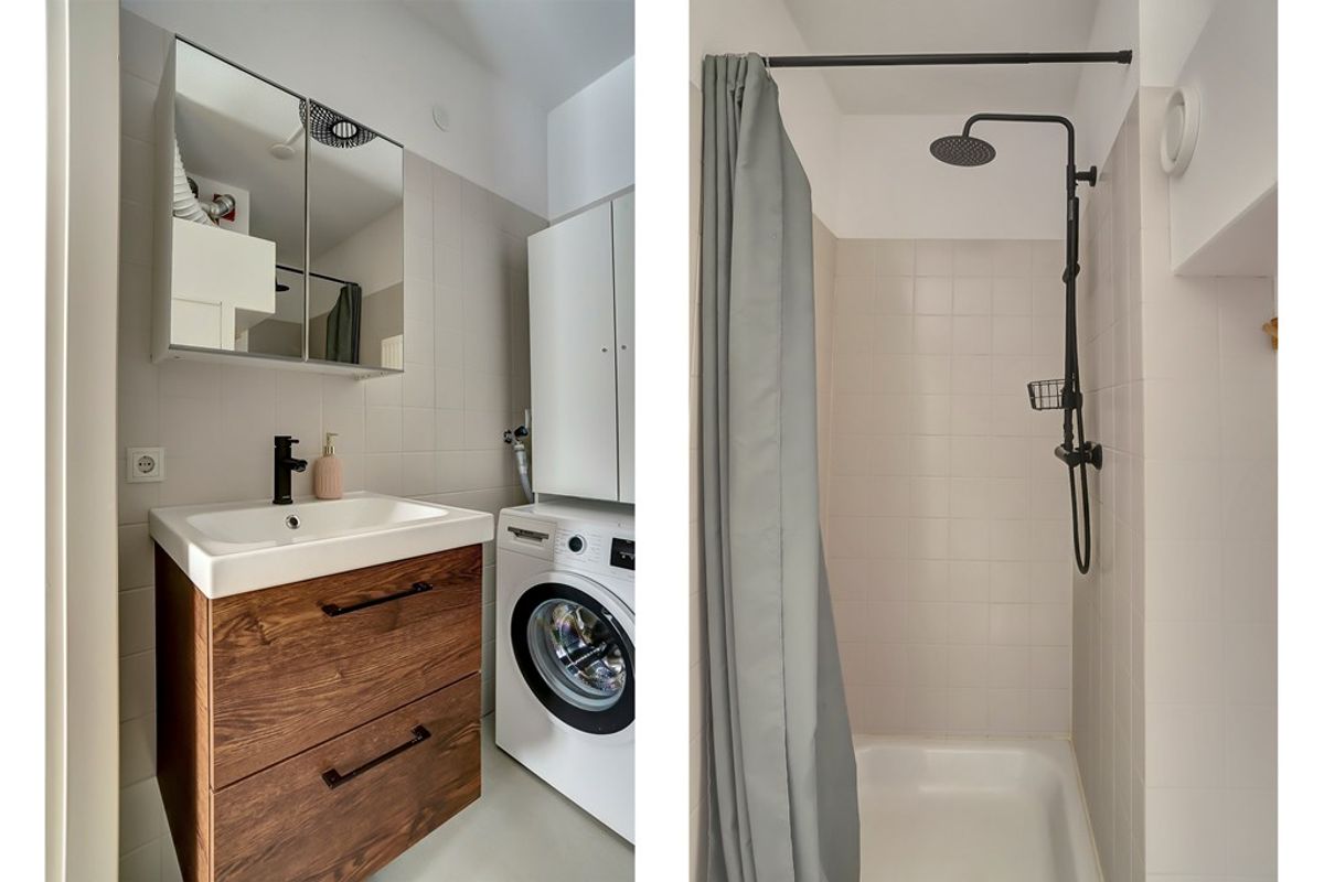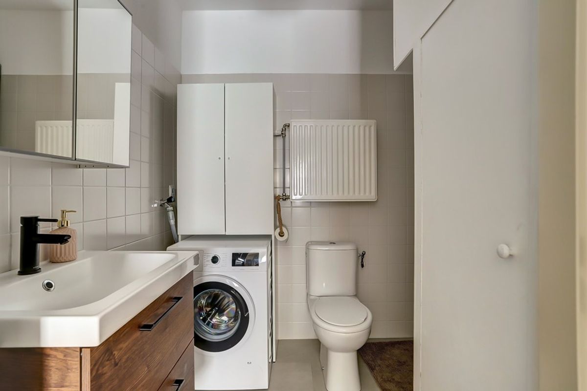 De hal biedt ruimte voor een garderobe en herbergt tevens de meterkast. Vanuit hier heb je toegang tot de netjes afgewerkte badkamer, voorzien van douche, wastafel, toilet, wasmachineaansluiting en de CV-installatie.
