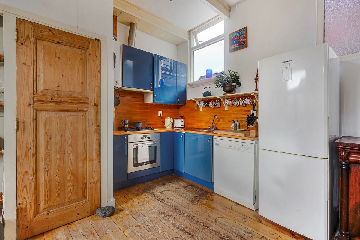 Een lichte woonkamer met originele houten vloeren en hoge balkenplafonds creëert direct een warme, huiselijke sfeer. De openslaande ramen met dubbel glas bieden uitzicht op de levendige Gasthuislaan. De eenvoudige keuken is voorzien van een 4-pits gaskookplaat, afzuigkap en inbouwoven. De Vaillant-ketel verzorgt het warme tapwater en de douche.