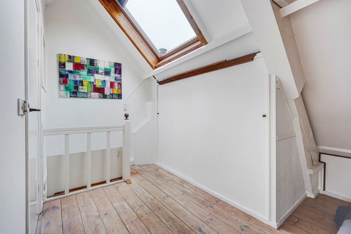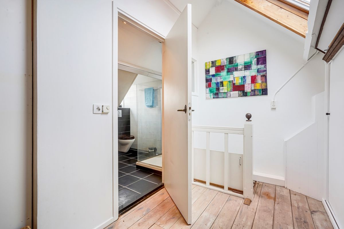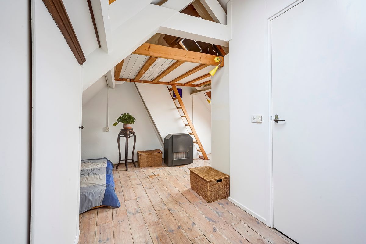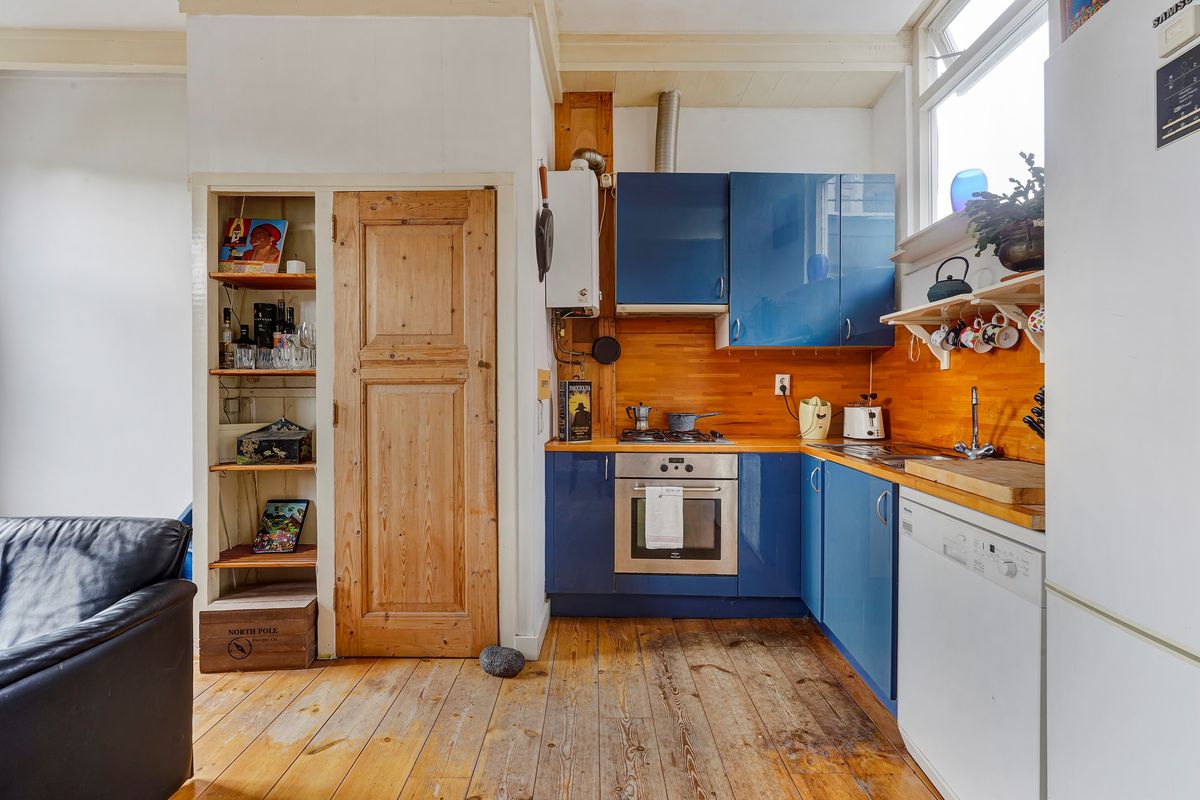 A bright living room with original wooden floors and high beamed ceilings immediately creates a warm, homely atmosphere. The double-glazed French windows offer views of the lively Gasthuislaan. The simple kitchen is equipped with a 4-burner gas cooktop, extractor hood, and built-in oven. A Vaillant boiler provides hot water and power for the shower.