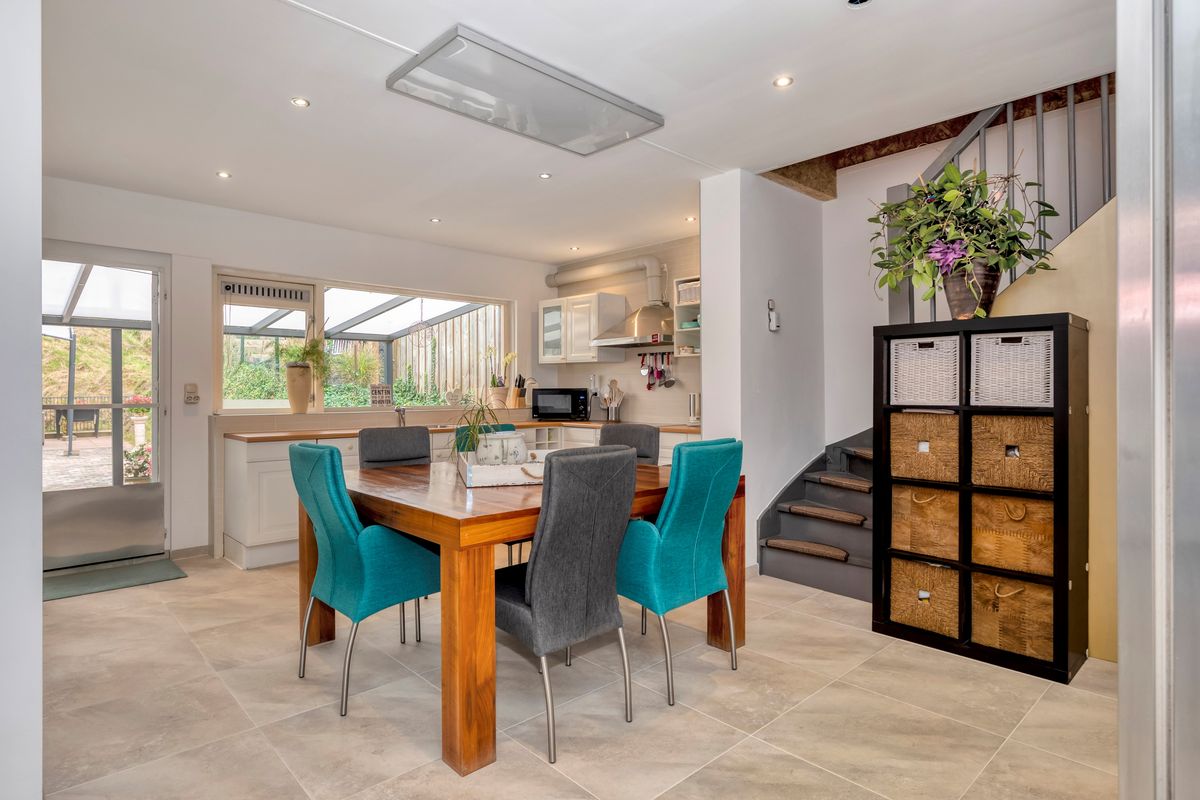 Vanuit de keuken is de tuin (middels openslaande deuren) bereikbaar.