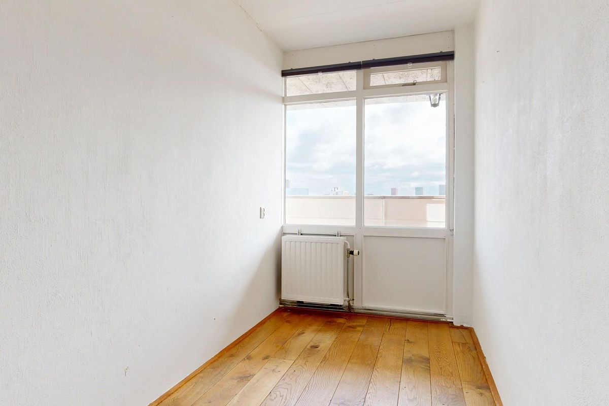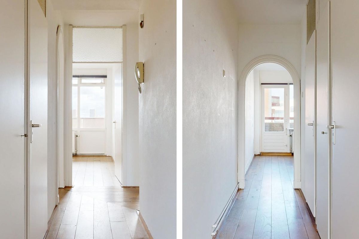Gezamenlijk entree met intercom en bellentableau, lift of trap naar de top etage met toegang tot het appartement. De centrale hal verbindt alle vertrekken, woonkamer met balkon uitkijkend richting de Beijenkorf, eetkamer/achterkamer met toegang tot een diep terrasbalkon. Tussen de woon en eetkamer is een semi open keuken voorzien van gaskookplaat, vaatwasser, oven en afzuigkap, twee slaapkamers van goed formaat aan de rustige achterkant, beide met vrij uitzicht.
