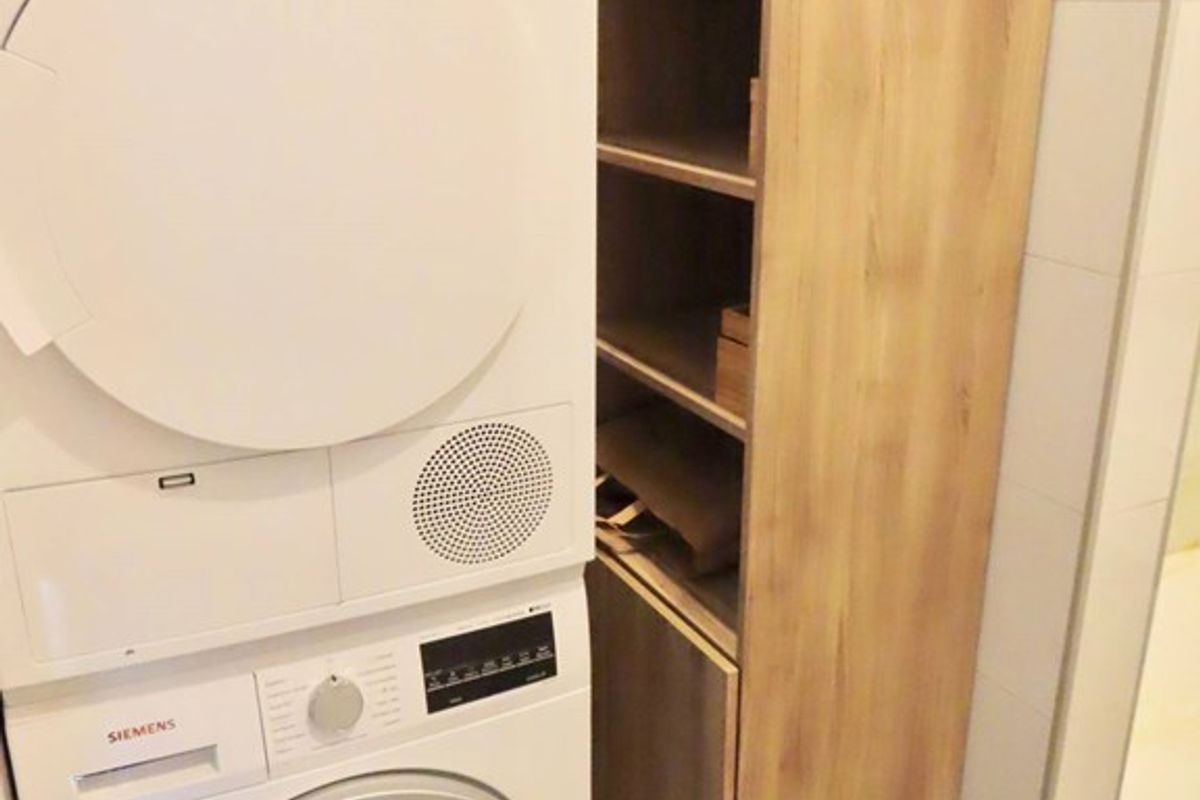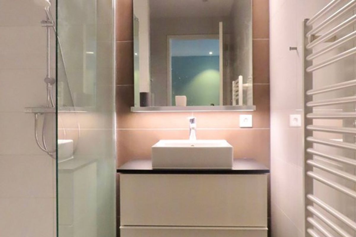 Bathroom with walk-in shower, sink, towel radiator and washing machine / dryer. Separate toilet.
