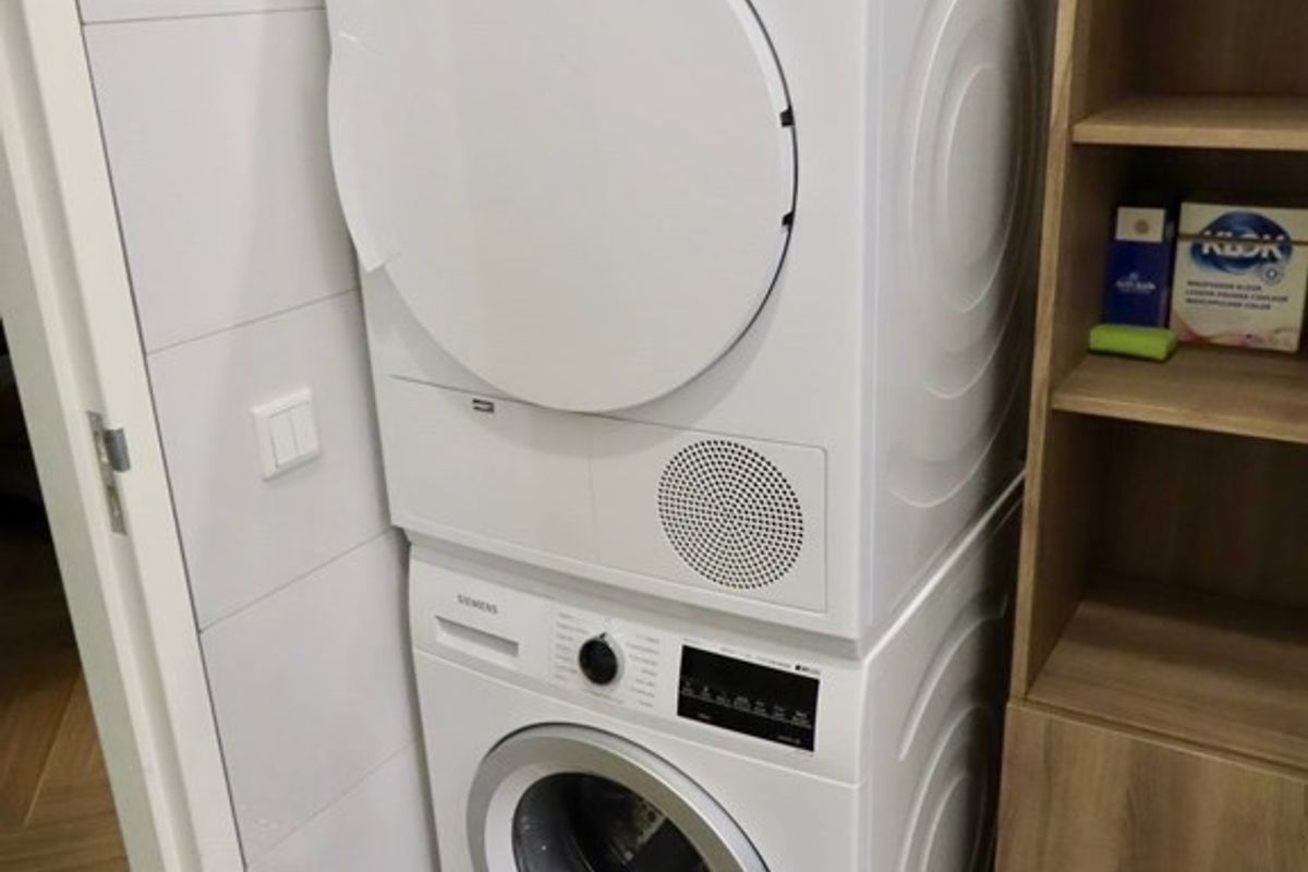 Bathroom with walk-in shower, sink, towel radiator and washing machine / dryer. Separate toilet.