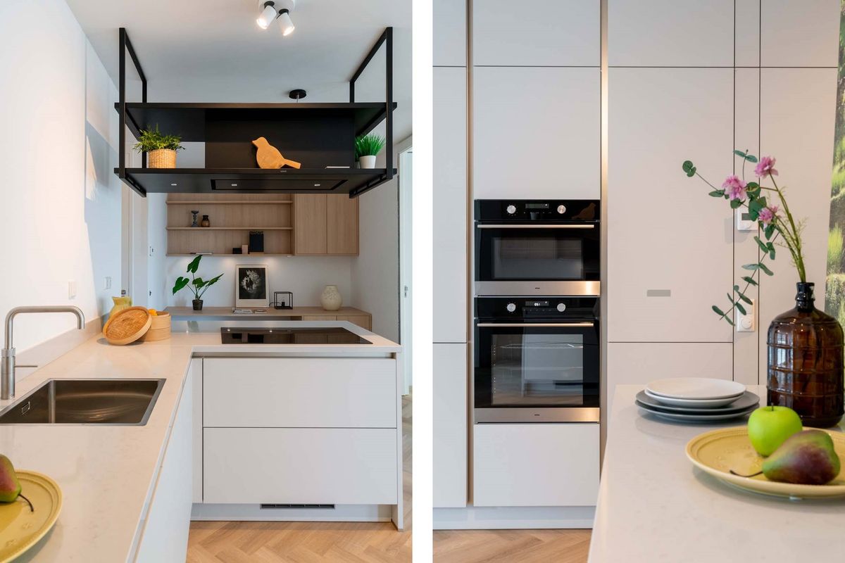 De zeer moderne open keuken is voorzien van divers inbouwapparatuur zoals een dubbele oven, vaatwasmachine, inductiekookplaat en koelkast met aparte ruime vriezer. De keuken beschikt tevens over een gezellige ontbijtbar.