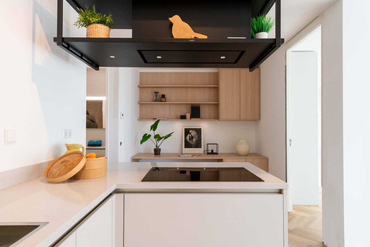 Behind the kitchen, a beautiful spacious workplace has been created with a spacious desk and additional storage space.