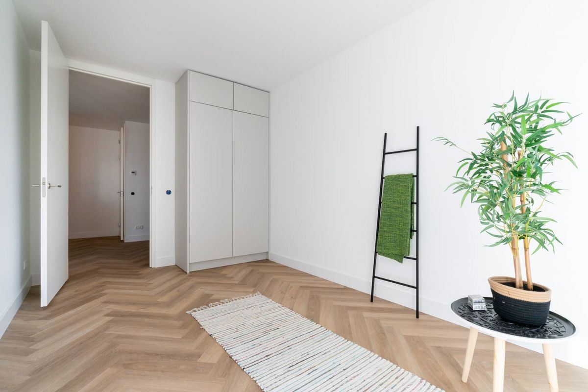 The entire apartment has a modern PVC herringbone floor. You enter the spacious hall, which provides access to the spacious bedroom, the living room, the separate toilet, the luxurious bathroom, spacious laundry/storage space and the meter cupboard.