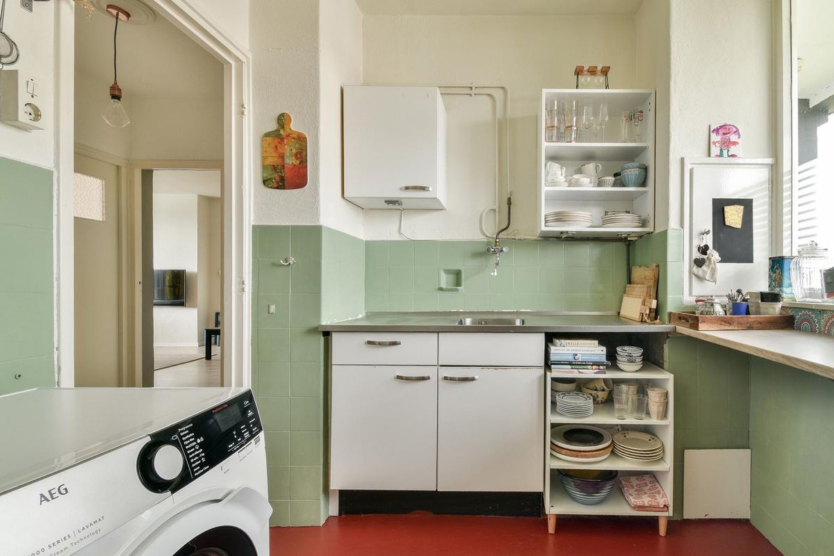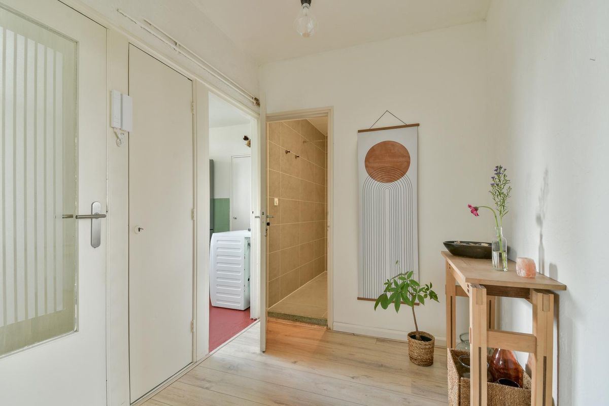 Galerij met vaste kasten. Entree/tochtportaal, hal met meterkast en toegang tot alle vertrekken, waaronder de woonkamer. De woonkamer is voorzien van een decoratieve in de wand ingebouwde vakkenkast en een vaste bergkast. De keuken ligt aan de voorzijde en is voorzien van een keukenblok en de wasmachine-aansluiting. Tevens is er een vaste kast met daarin de cv-ketel.
