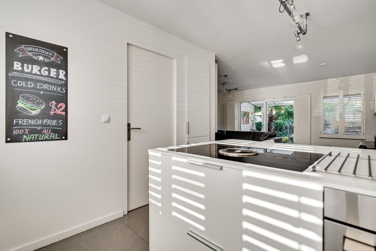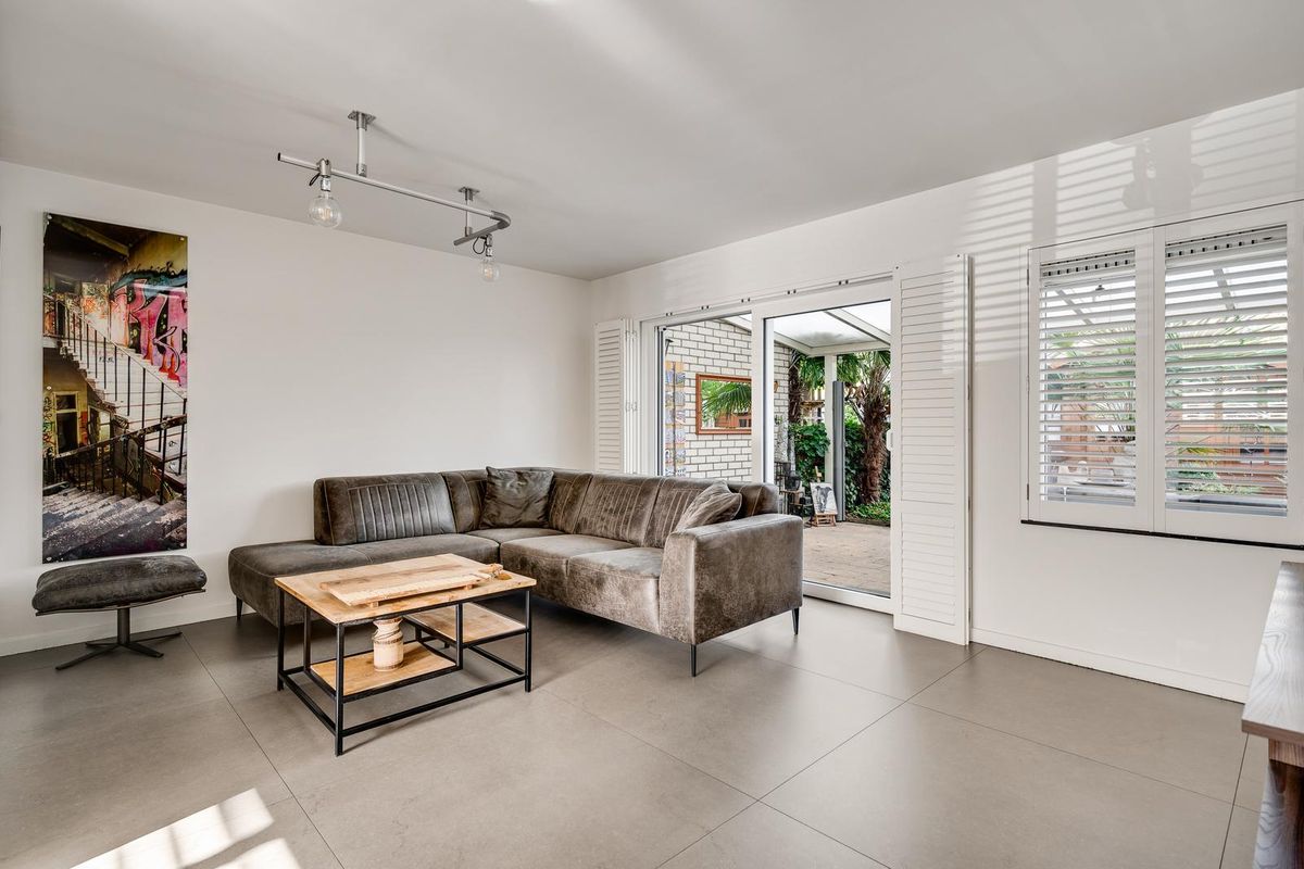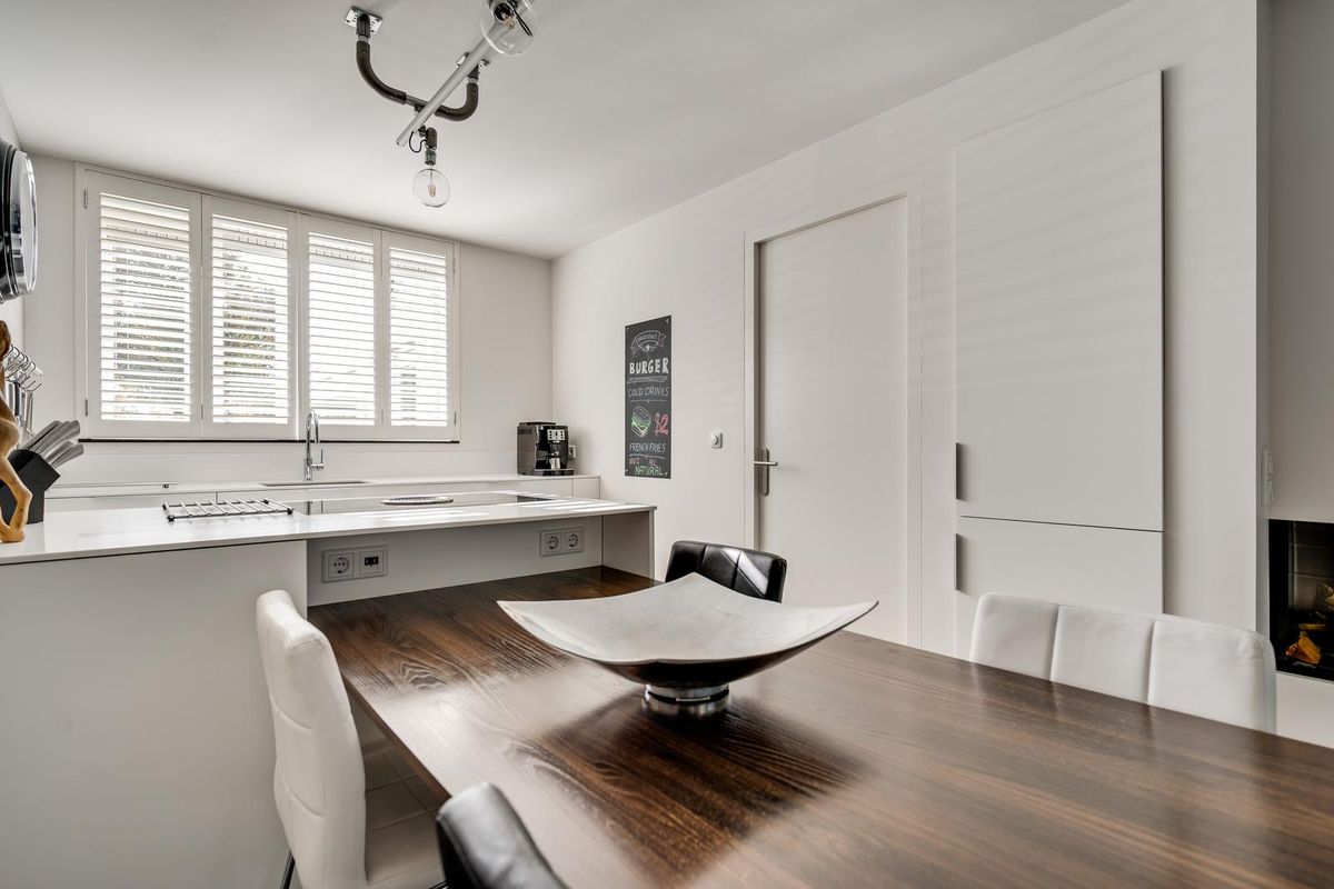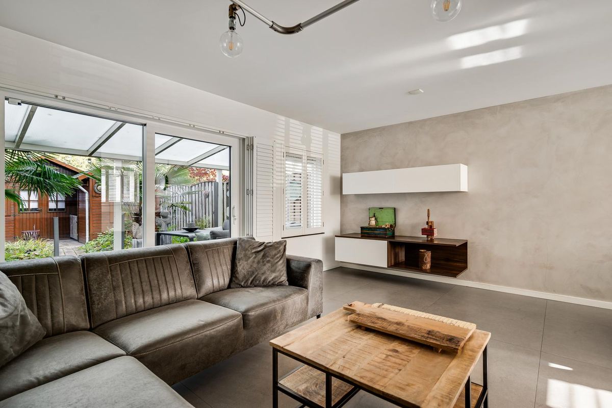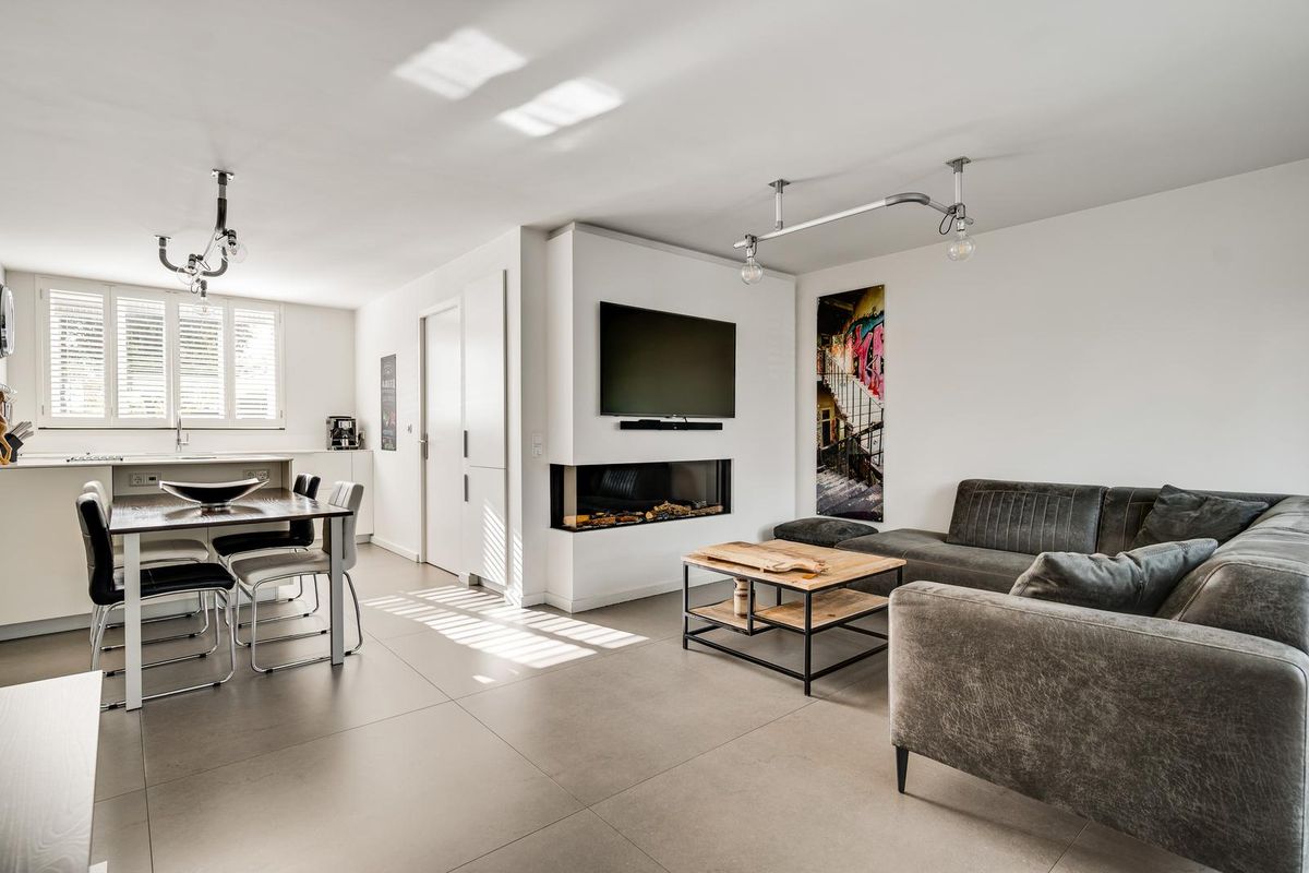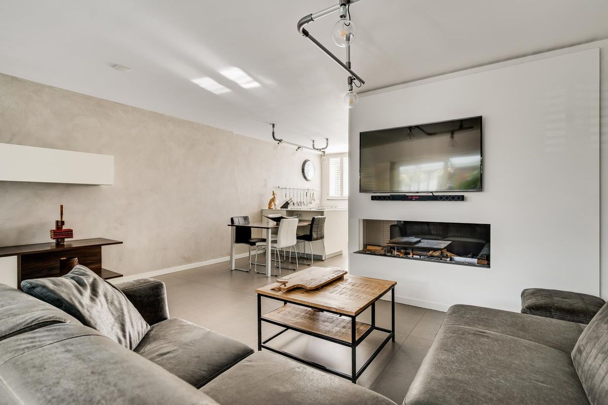 De gezellige woonkamer is een heerlijke plek om thuis te komen, dankzij de grote ramen en de schuifpui valt er volop natuurlijk licht binnen en geniet je optimaal van het tuincontact. De moderne gashaard zorgt voor extra sfeer tijdens de koudere maanden.