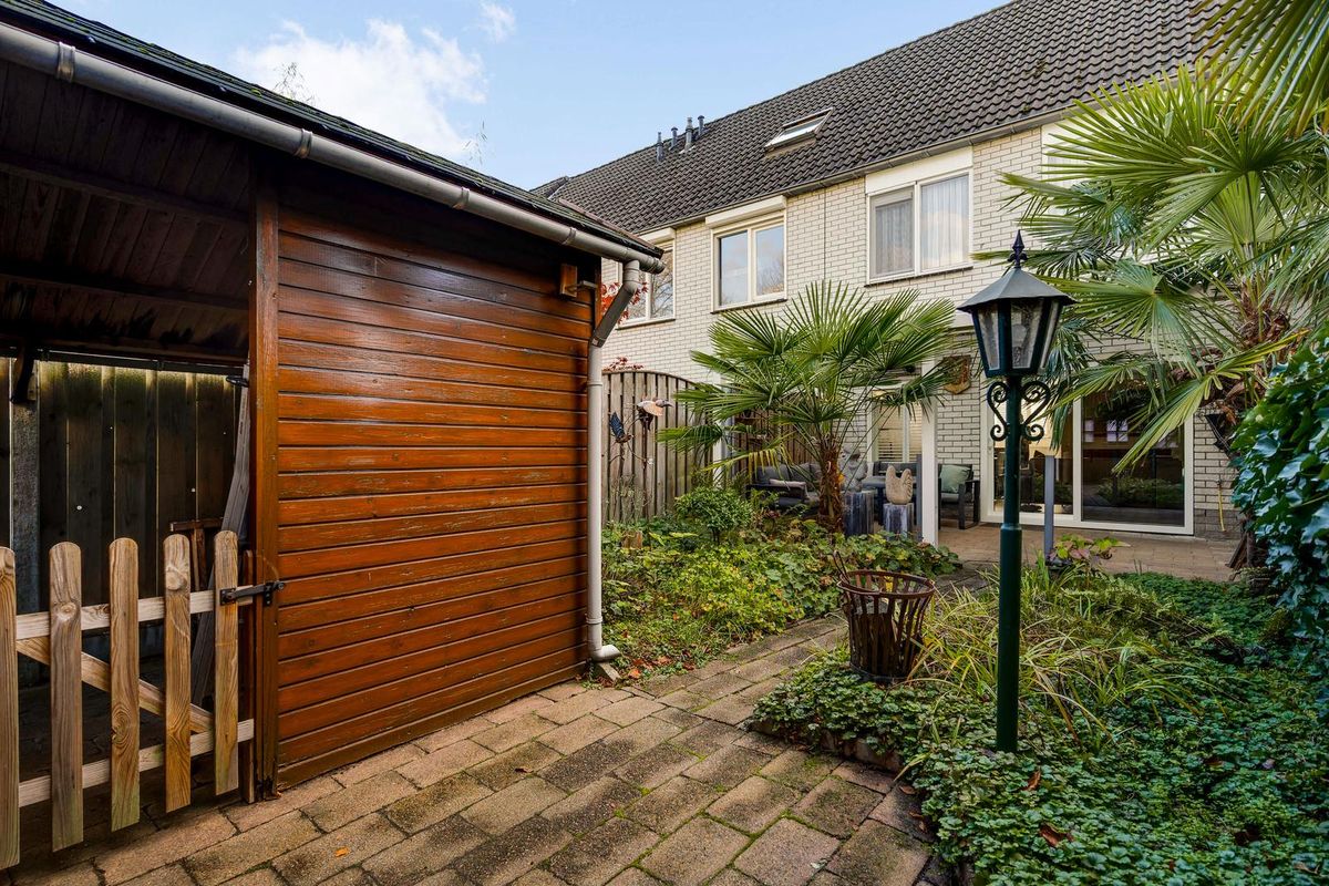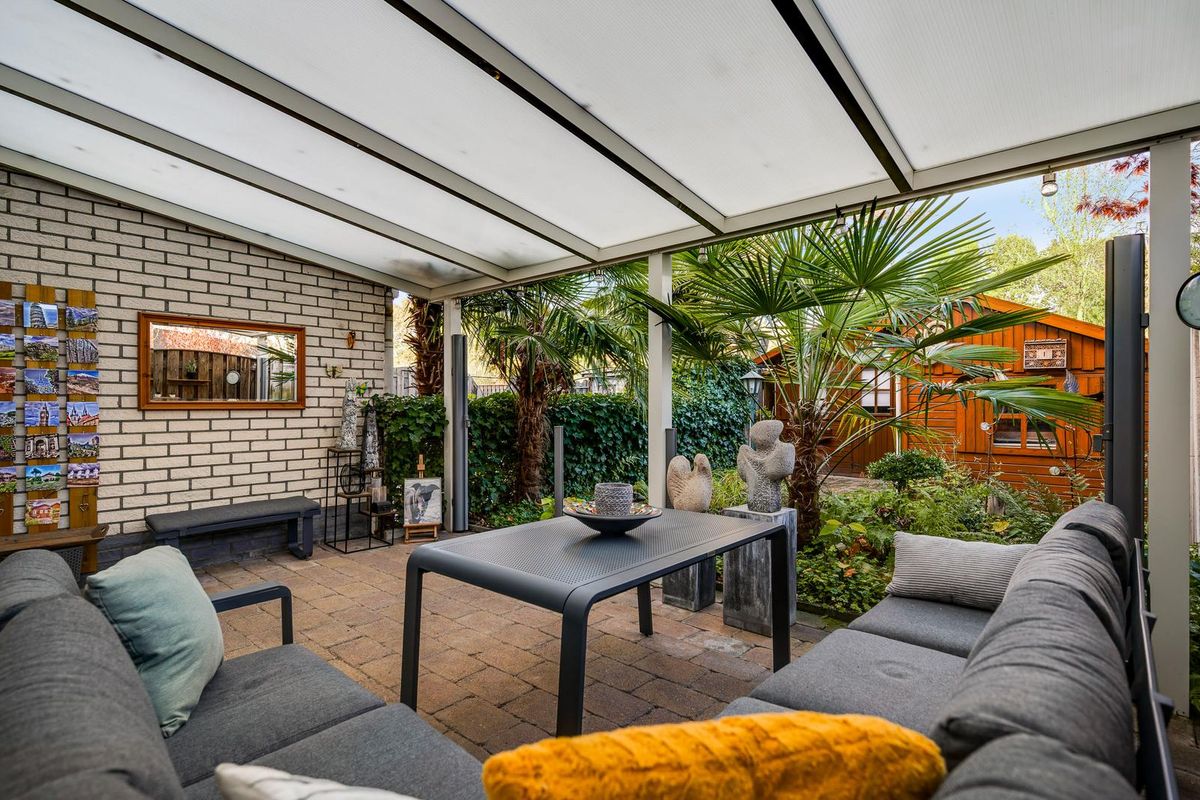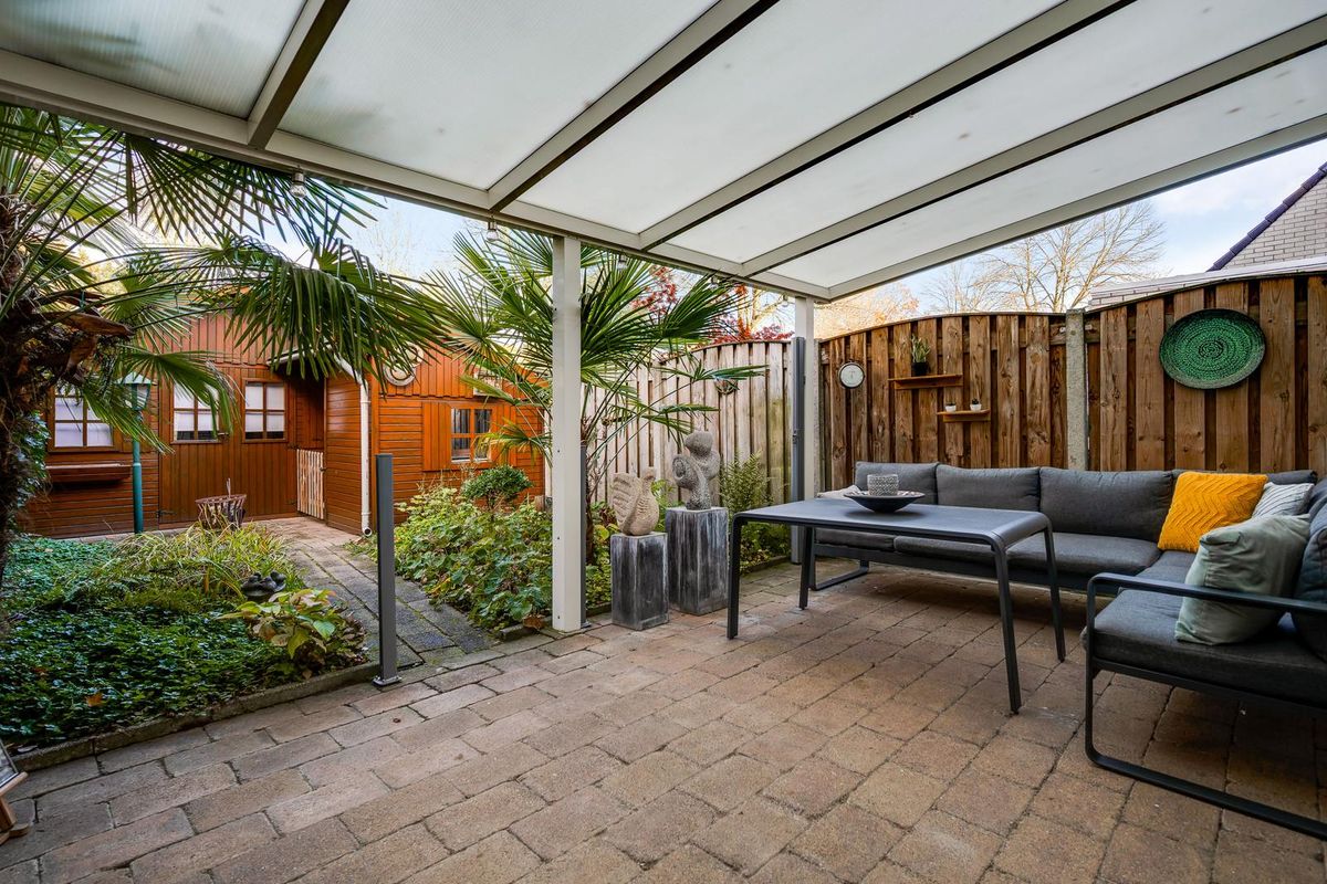 De gezellige achtertuin is een fijne plek om te ontspannen of samen te genieten van lange zomeravonden. De tuin is sfeervol aangelegd met volwassen beplanting, een vaste overkapping, houten berging en extra overkapping voor fietsen of motor. Via de vrije achterom heb je gemakkelijk toegang tot de tuin.