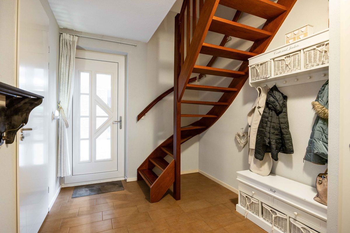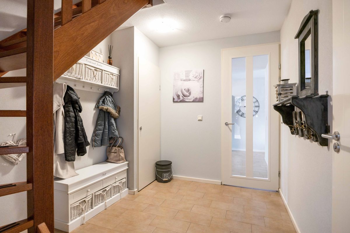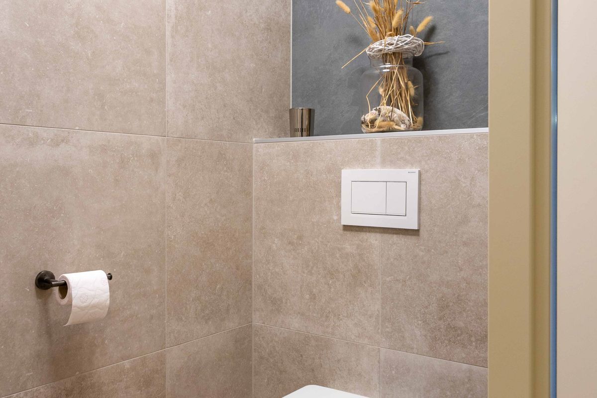 Je komt binnen in een ruime hal met frisse uitstraling waar je alle dagelijkse rompslomp even van je afschudt. Hier vind je de meterkast, de trap naar boven en de moderne toiletruimte met wandcloset – natuurlijk voorzien van een fonteintje. Fijn detail: alles is modern afgewerkt, zodat je direct voelt dat je in een eigentijds huis bent.