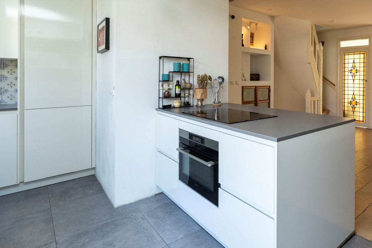Aan de achterzijde is de open keuken gesitueerd en beschikt over een inductiekookplaat met oven, vaatwasser, afzuigkap, combioven en koelkast. De afzuigkap is met inbouwspots netjes verwerkt in het plafond.