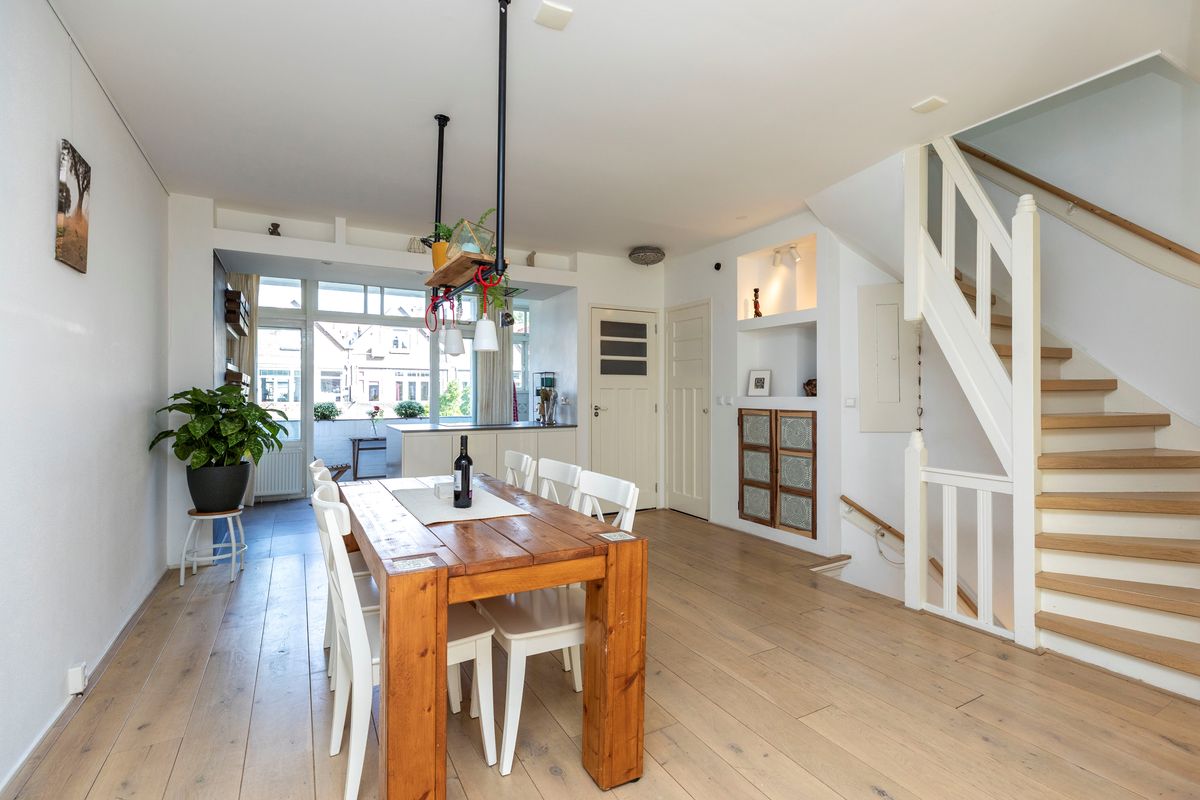 Je komt direct binnen in de prachtige leefruimte met een mooie eikenhouten vloer. Dit is hoe wonen hoort te zijn! De sfeer, moderne afwerking met een toffe combinatie van materiaal- en kleurgebruik en de grootte zorgen dat jij elke dag met een glimlach door het huis loopt. De voorzijde wordt als zithoek gebruikt en heeft grote raampartijen, samen met de erker zorgen die voor een mooi lichtinval.