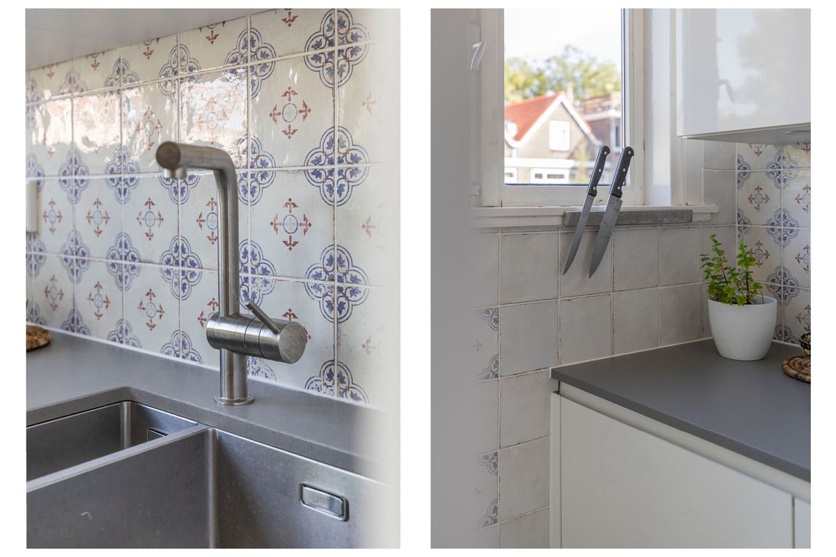 De keuken bestaat uit een kookeiland en een recht deel waarbij de achterwand mooi betegeld is met een speels patroon. Een hele gezellige keuken voor het klaarmaken je eten of bij te praten tijdens het koken. Ook hier vallen de grote raampartijen op waardoor je aan deze zijde ook mooi het zonnetje naar binnen ziet schijnen.