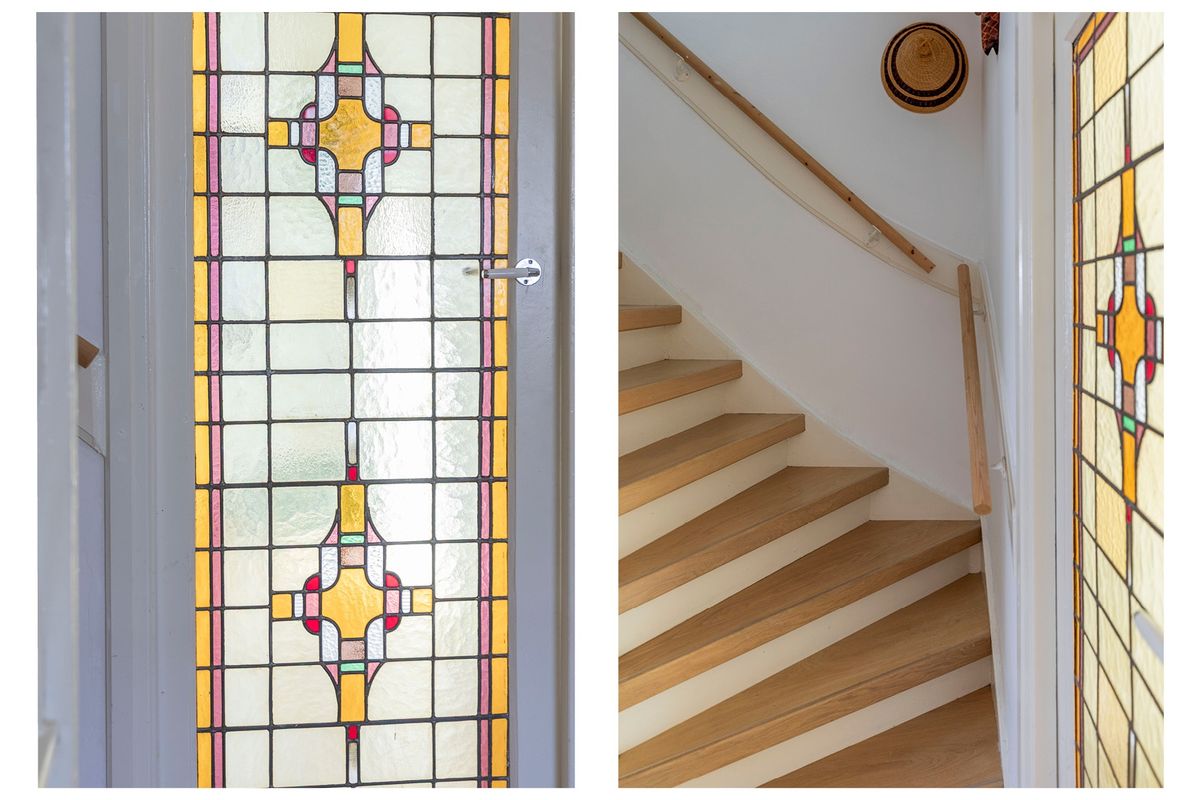 In het woongedeelte geeft de prachtige deur met gekleurde glas-in-loodramen toegang tot de voor/zijkamer. Deze kamer is qua afmetingen ideaal als werk-, studeer- of logeerkamer.
