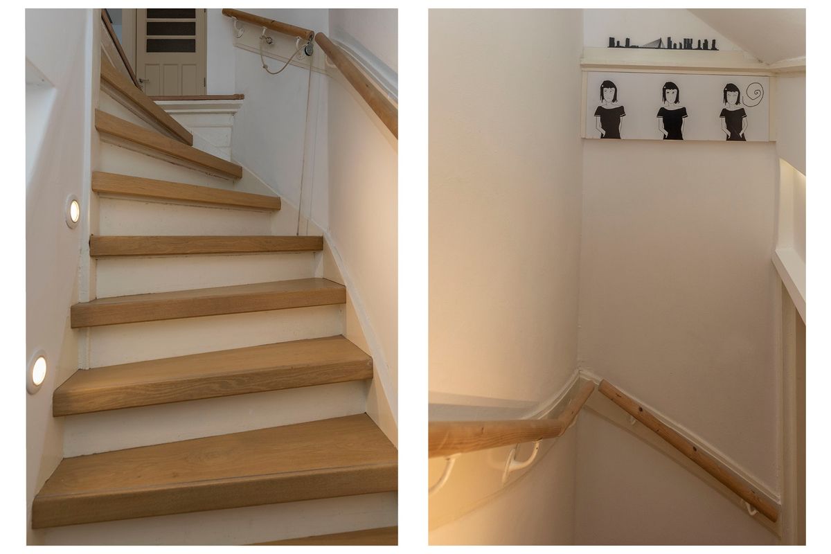 Het toilet op deze verdieping is netjes verzorgd en de open trap biedt toegang de derde verdieping.