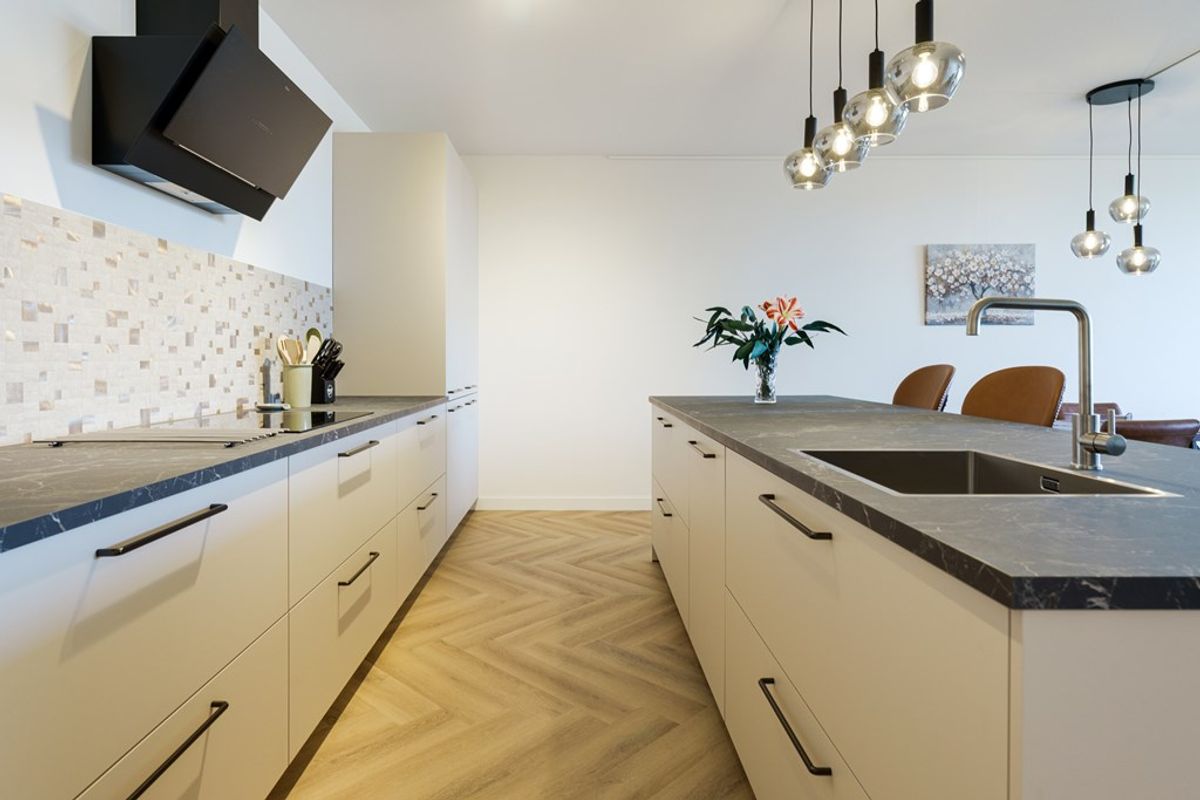 De luxe, geheel nieuwe open keuken met royaal spoeleiland vormt een echte blikvanger in de ruimte. De keuken is uitgerust met alle gewenste inbouwapparatuur, waaronder een ruime spoelbak, combi-oven, vaatwasser, koel-vriescombinatie en een stijlvolle, ingebouwde afzuiging. Hiermee is het een perfecte plek voor zowel dagelijkse maaltijden als culinaire avonden.