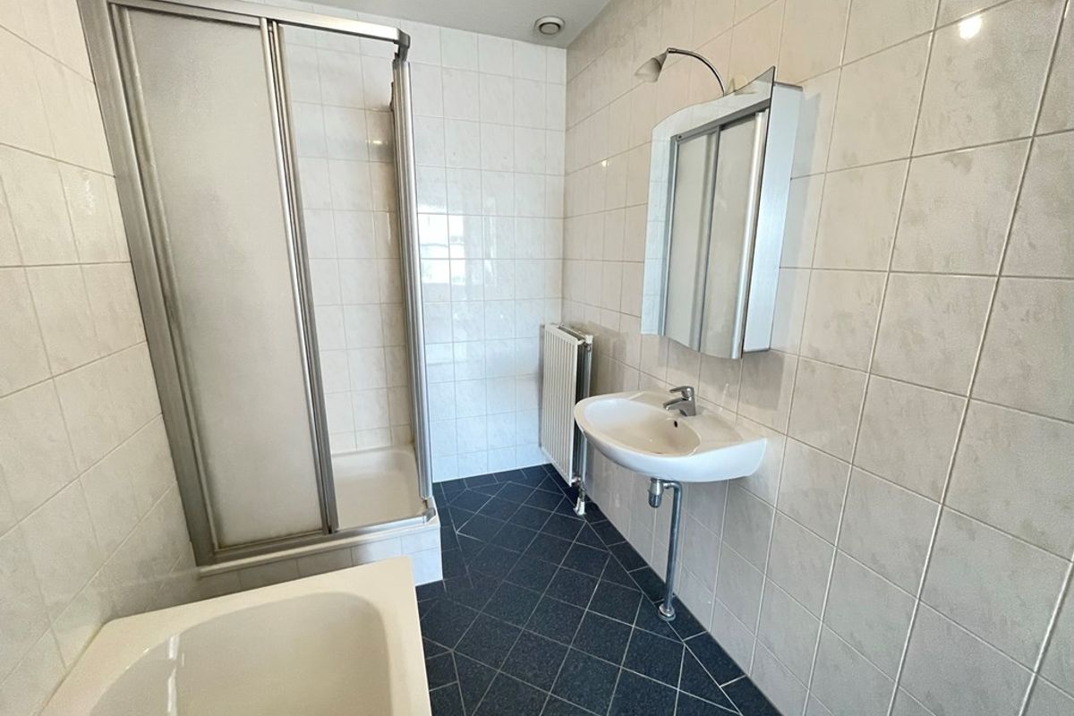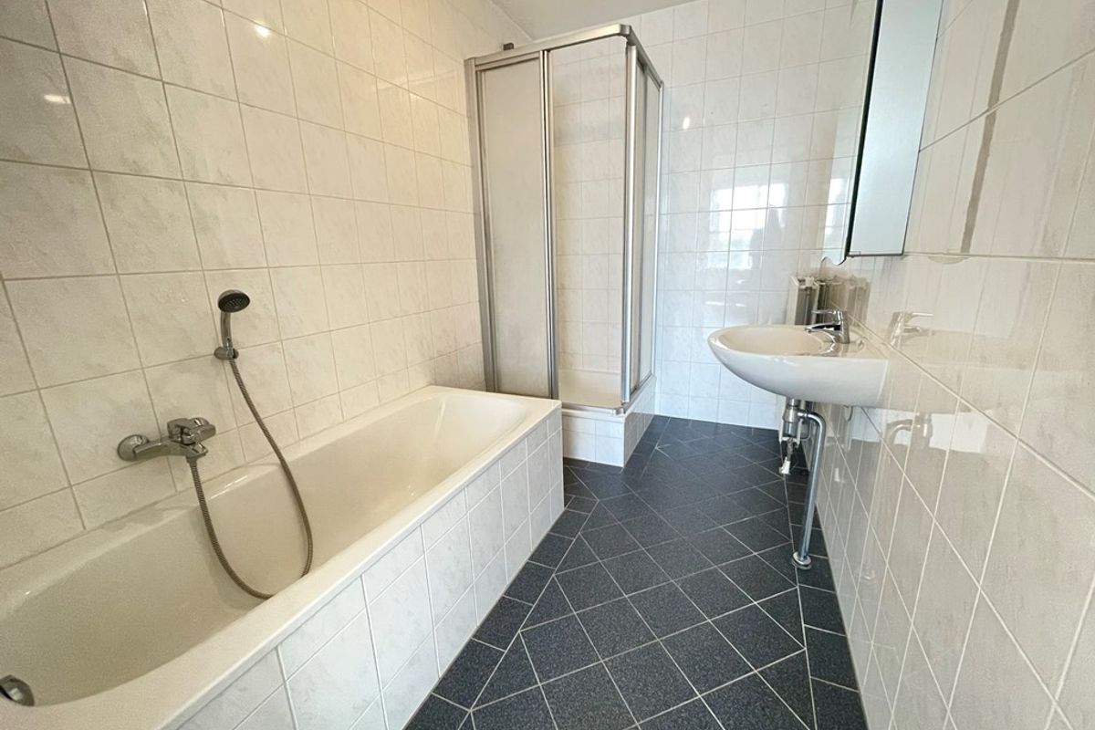 Ruime volledig betegelde badkamer die voorzien is van een ligbad, douche, wastafel met spiegel.