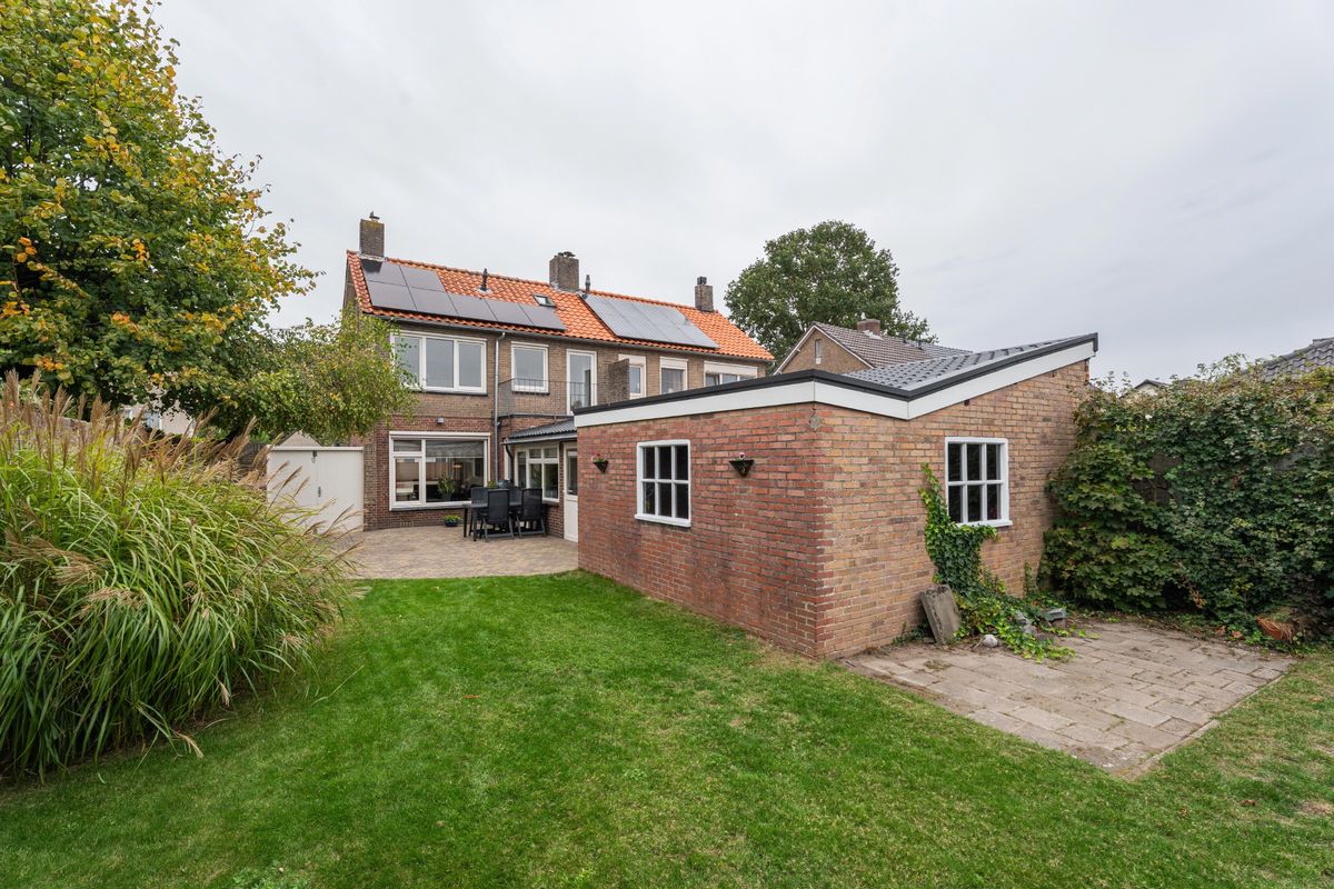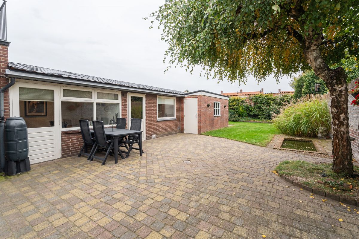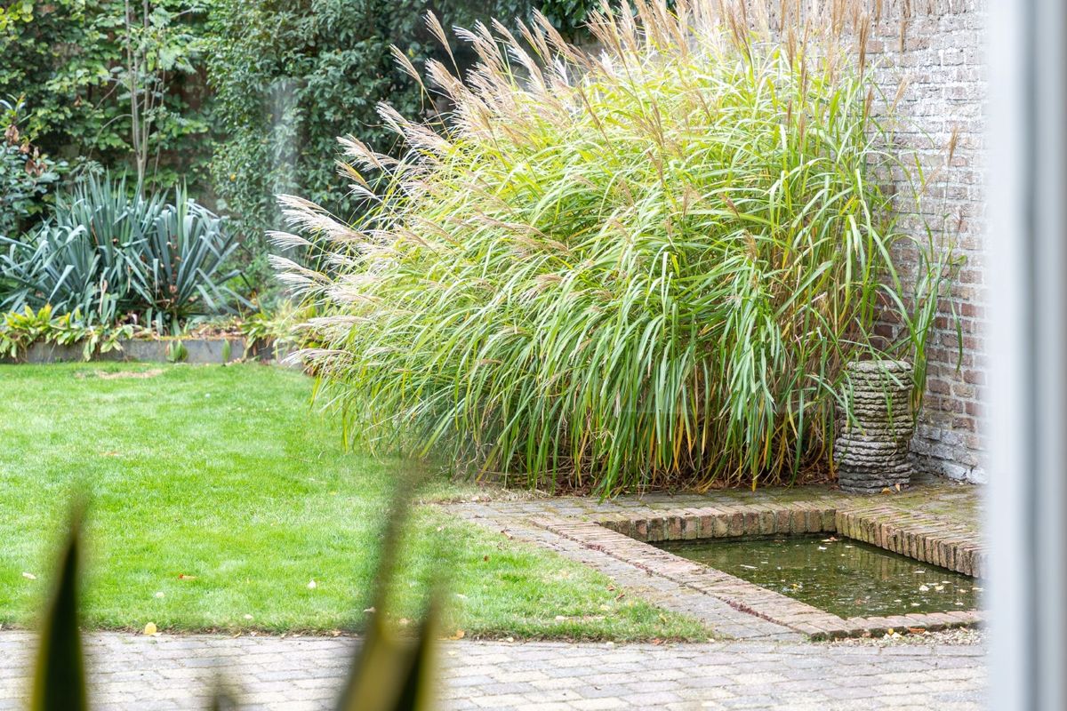 De op het zuidoosten gesitueerde achtertuin is volledig omsloten en voorzien van een groot terras, een gazon, groenborders met volwassen beplanting, een kleine vijver en een dubbele poort voor toegang tot de oprit.