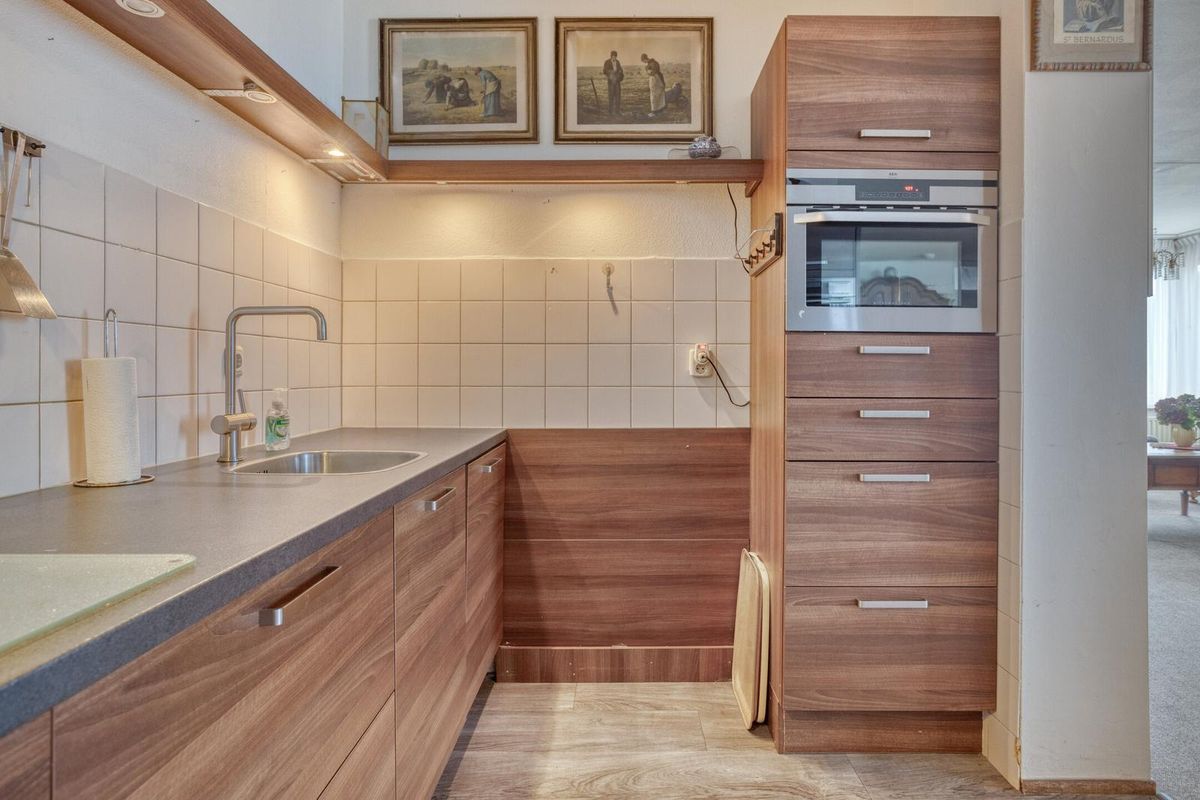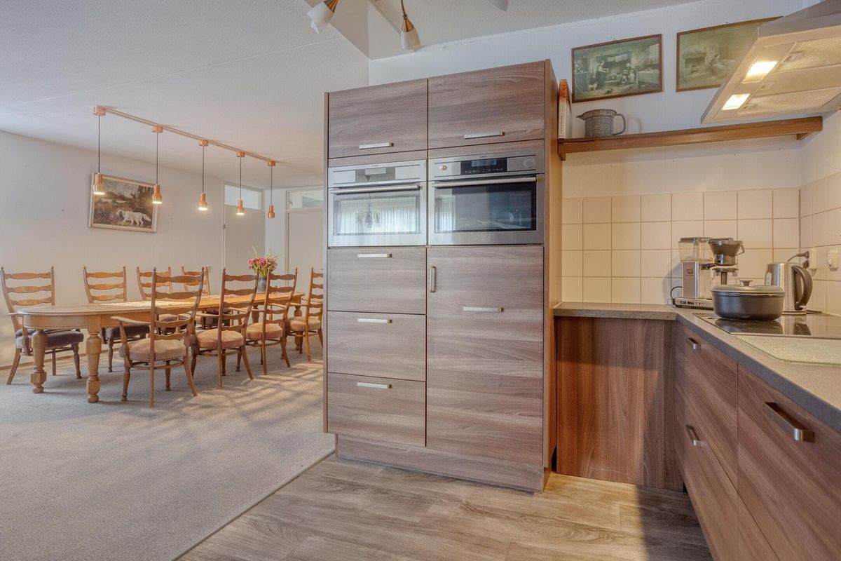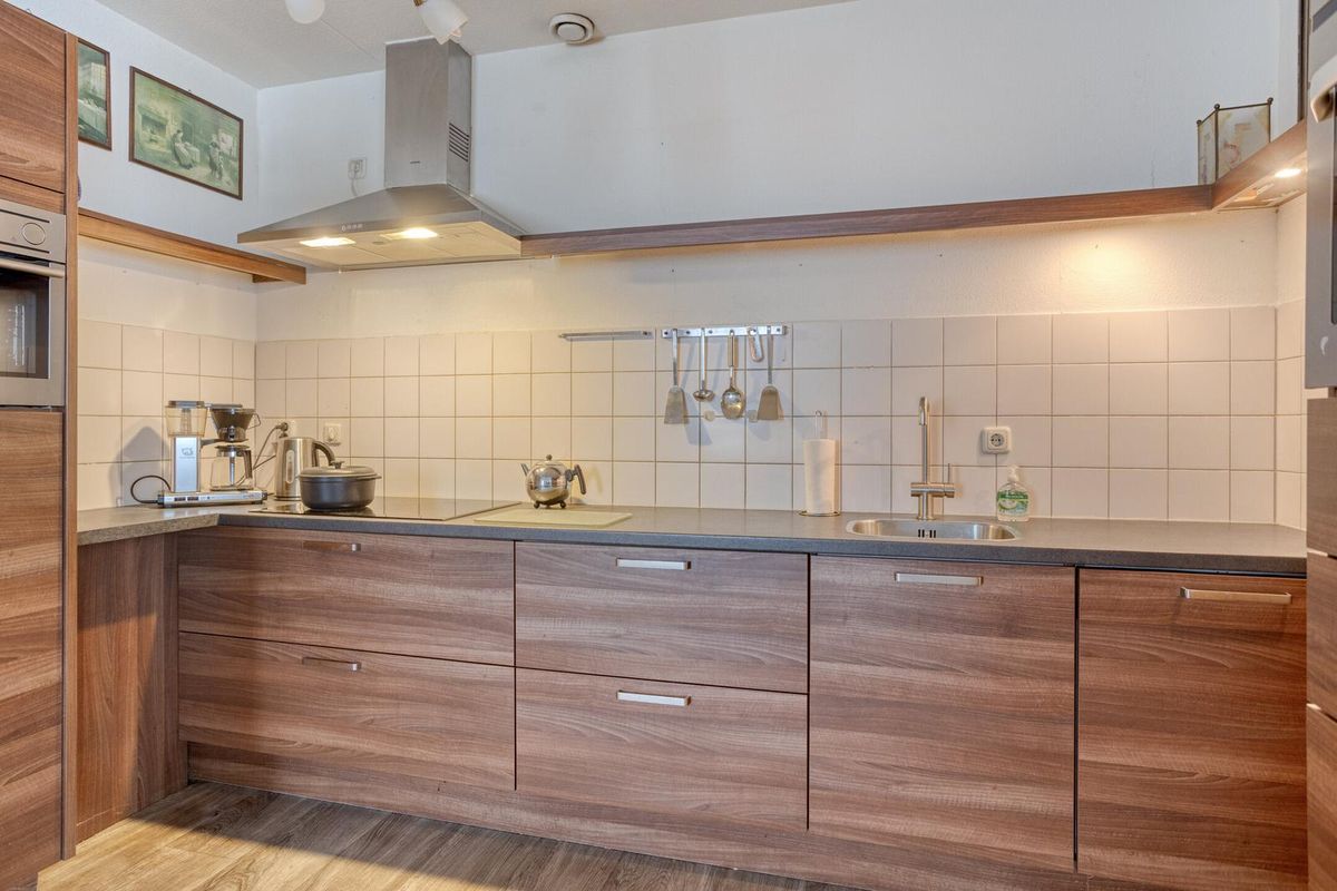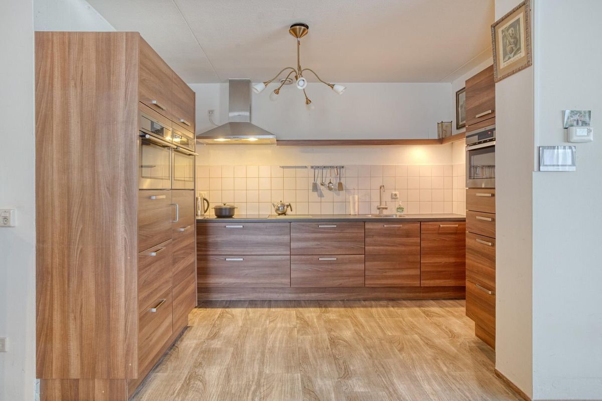 In het midden van de woonkamer is de openkeuken gesitueerd. Deze heeft een U-opstelling met ruim voldoende kasten en lades. Er zijn twee ovens, een magnetron, een inbouw vaatwasser en een koelkast aanwezig. In het werkblad is er een inductiekookplaat ingebouwd met afzuigkap als ook een RVS-spoelbak.