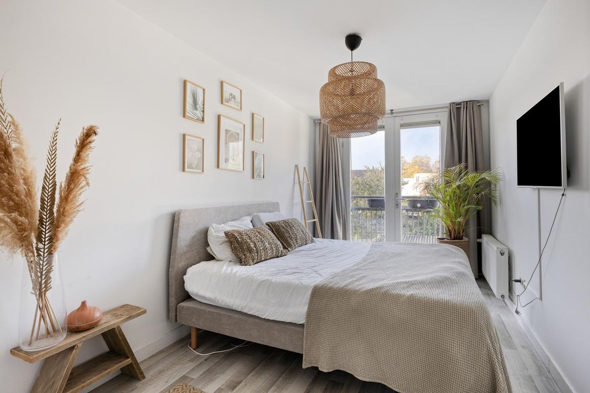 Aan de voorzijde van de woning ligt een slaapkamer met warme houten vloer en lichte stucwanden, een plek die meteen comfortabel en uitnodigend aanvoelt. Perfect voor een rustige nachtrust of een eigen plekje om te ontspannen.