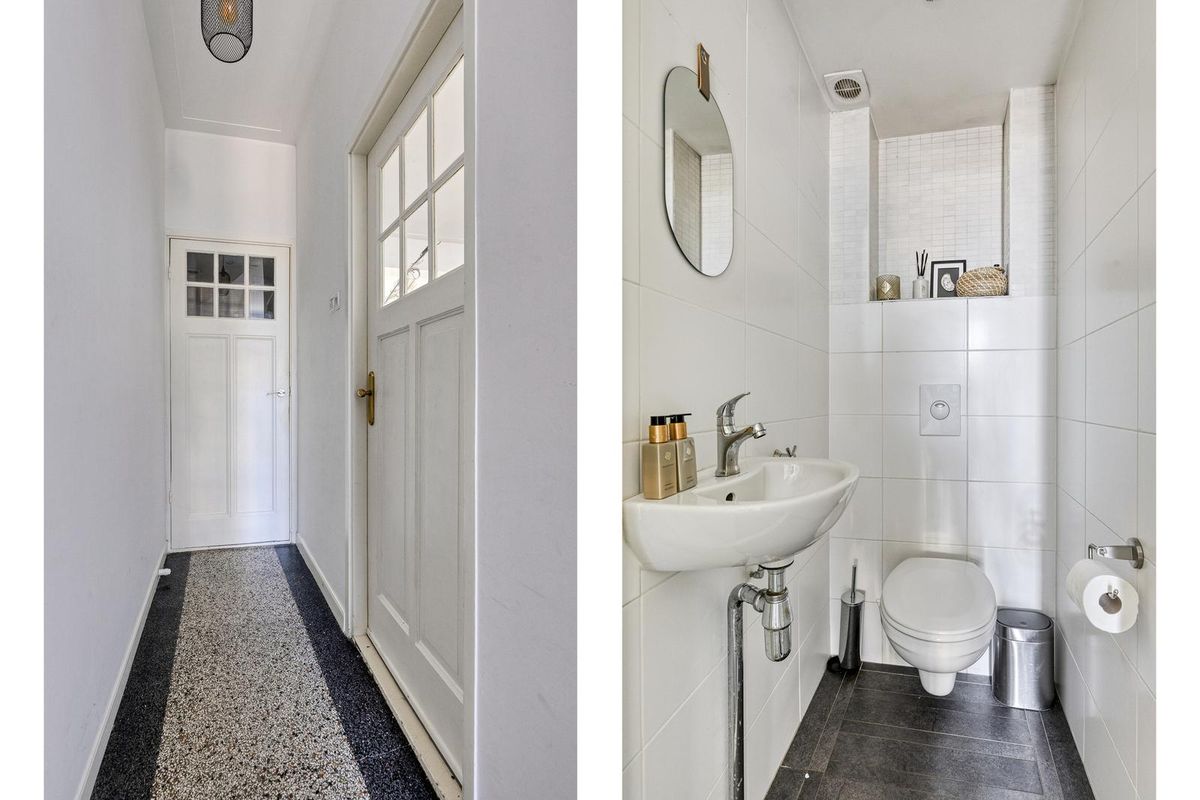 Zodra je de voordeur opent, word je verwelkomd door de authentieke charme van de woning. De granito-vloer, stucwanden en het stucplafond geven meteen het gevoel van een warm, comfortabel thuis. Vanuit de entree heb je toegang tot de meterkast, het toilet, de trapopgang en de woonkamer; een ruimte die uitnodigt om te blijven.