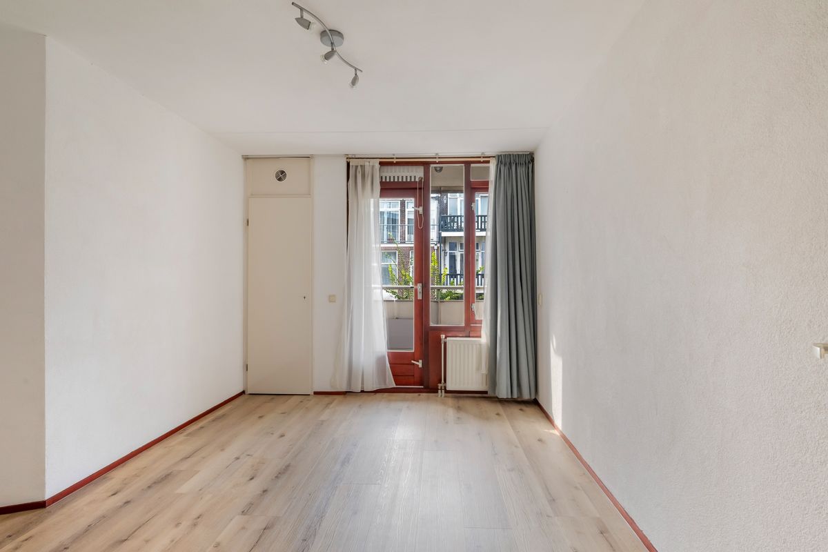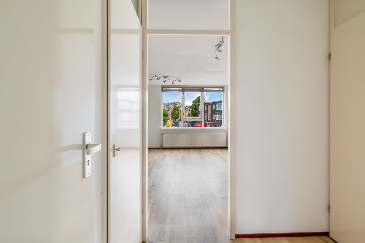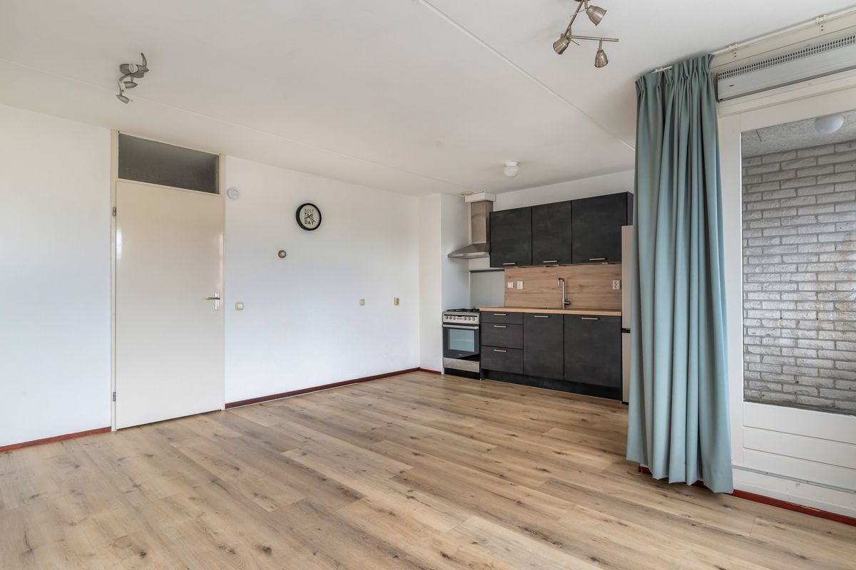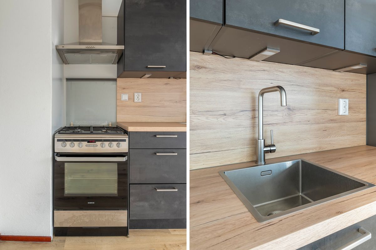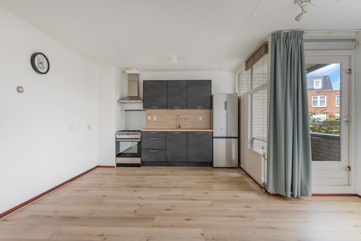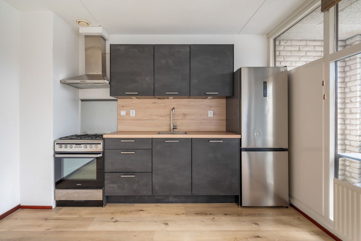 De hal biedt toegang tot een separaat toilet en leidt naar de lichte woonkamer aan de voorzijde van het appartement. Vanuit de woonkamer heb je een vrij uitzicht op het pleintje en toegang tot het voorste balkon. De open keuken is modern en van alle gemakken voorzien: een vaatwasser, oven, gasfornuis, grote koelkast en vriezer. De keuken is circa vier jaar oud en sluit mooi aan bij de rest van het interieur.