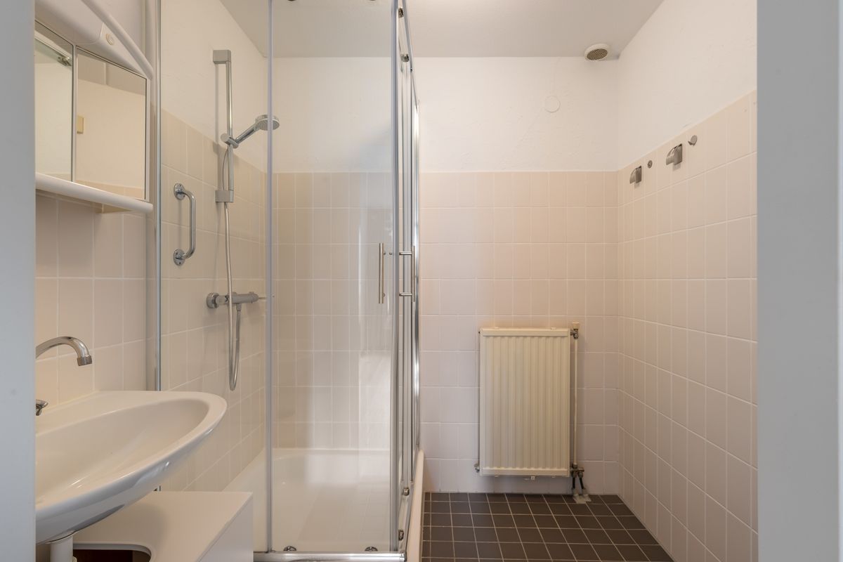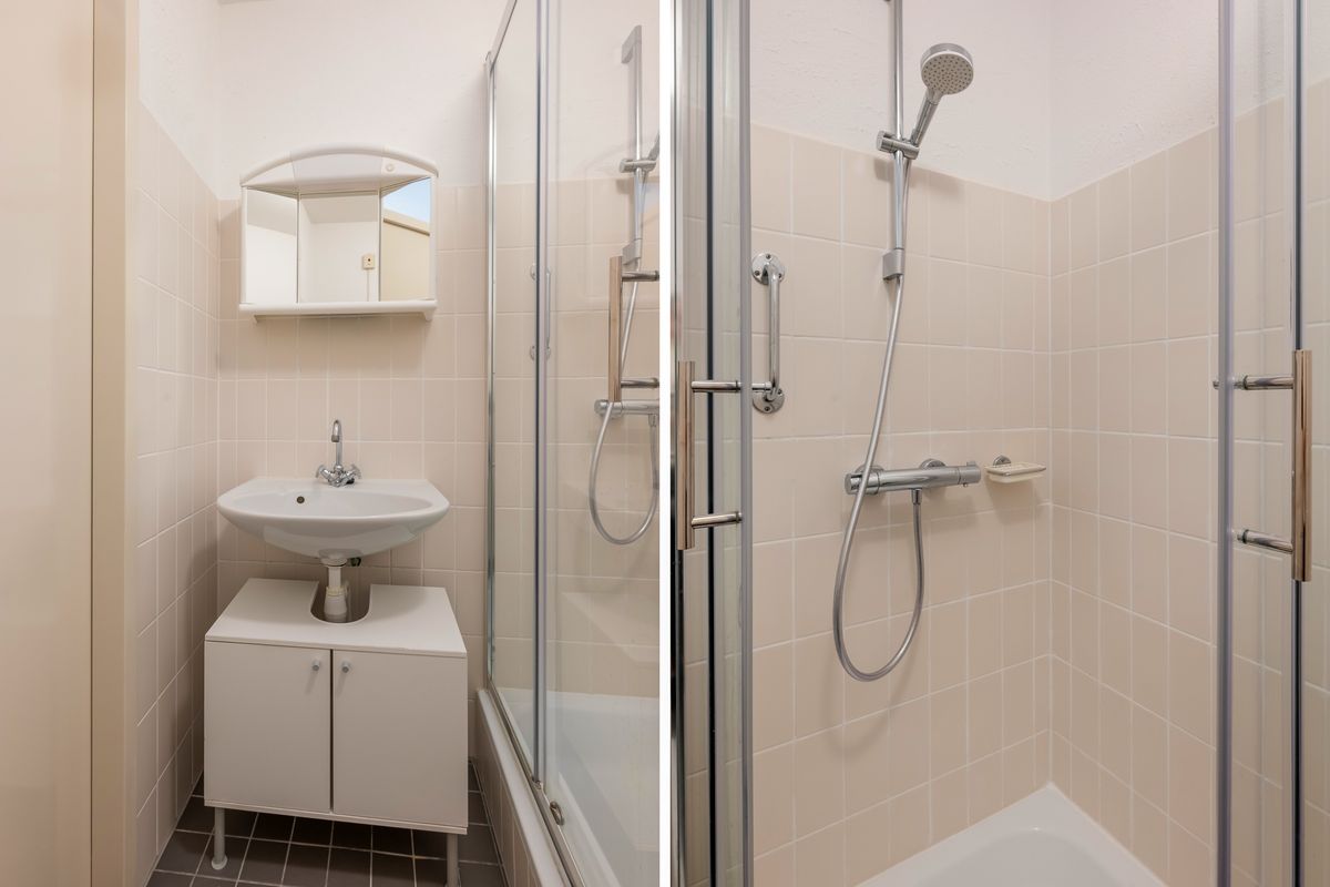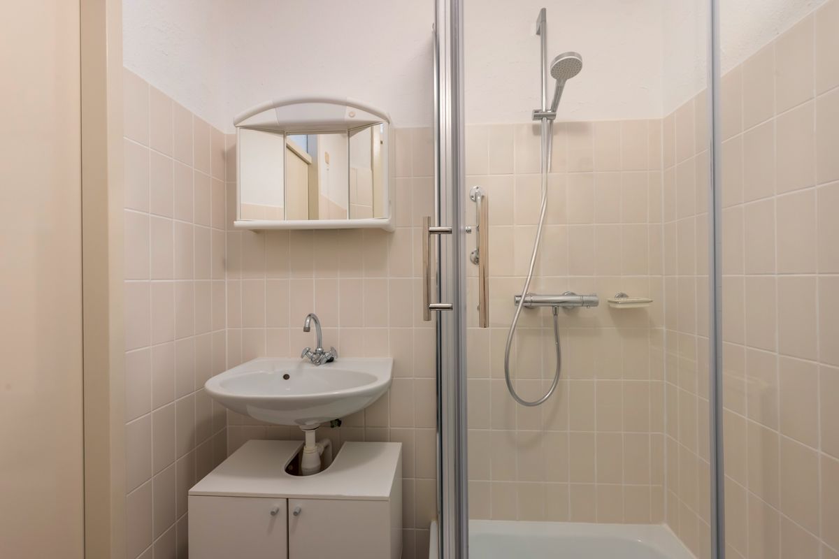 At the rear is the spacious bedroom, offering a peaceful place to sleep. This room provides access to the rear balcony and features a convenient built-in wardrobe. From the bedroom, you enter the bathroom directly, which is fitted with a shower, washbasin, and bathroom cabinet. The bathroom is stylishly finished with light wall tiles and a dark tiled floor.