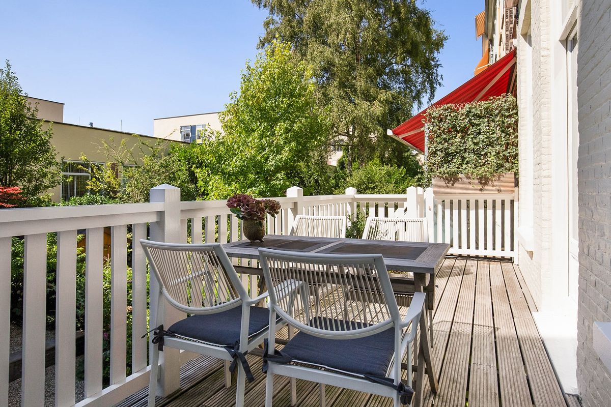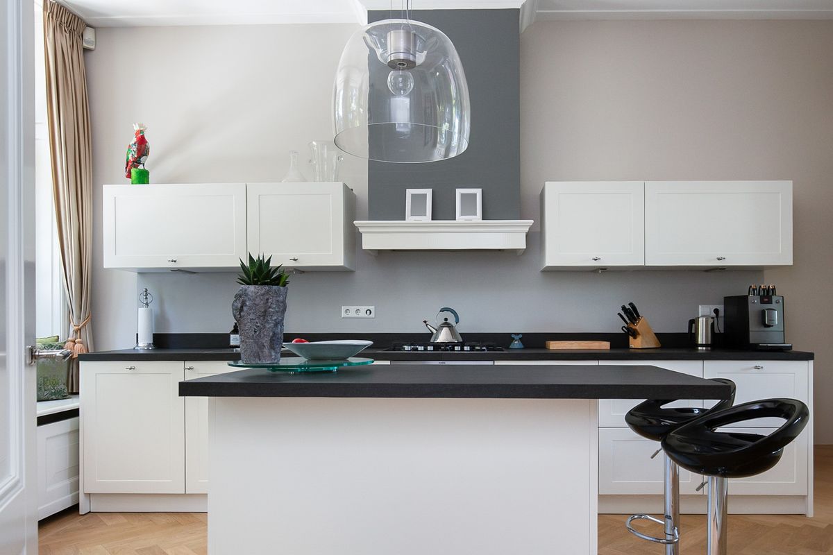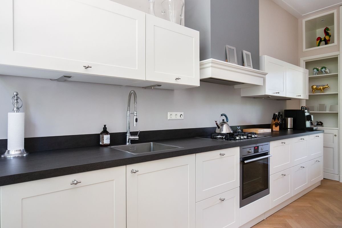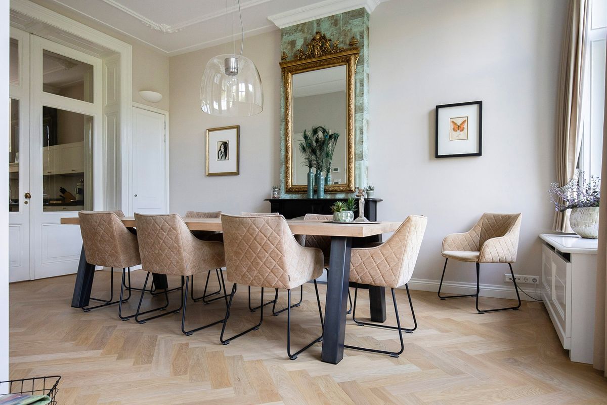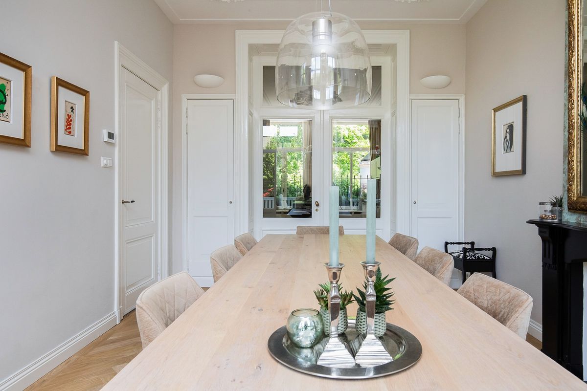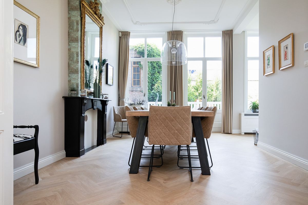 De entree van de woning bevindt zich op de bel-etage. U komt binnen in de hal met toegang tot de keuken en overloop, op de overloop bevindt zich een separaat toilet en de trap naar souterrain en eerste etage. De trappen zijn bij de renovatie vervangen en ‘lui’ gemaakt. Aan de voorzijde ligt de stijlvolle open keuken met kookeiland en moderne inbouwapparatuur, perfect voor kookliefhebbers. Aansluitend bevindt zich de eetkamer, een prachtige, lichte ruimte met openslaande deuren naar het ruime en zonnige balkon aan de achterzijde. Hier geniet u van de middag- en avondzon.
