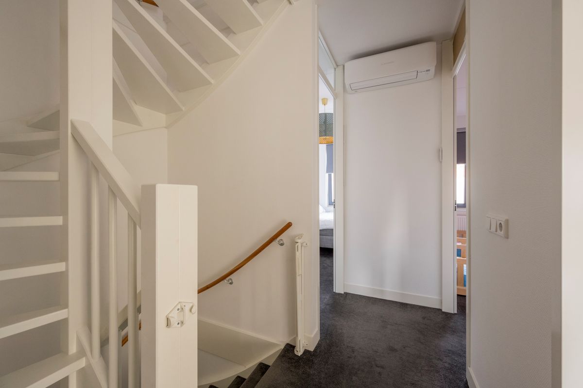 Aan de achterzijde is een royale slaapkamer met een groot dakkapel (2022) gerealiseerd. Op de overloop treft u een praktische werkplek en in een ombouw zijn de wasmachine en droger geplaatst. Op deze verdieping veel berging middels de vaste kasten in de slaapkamer, bij de werkplek en achter het knieschot. Verwarming en koeling middels een airconditioning gesitueerd in de slaapkamer.