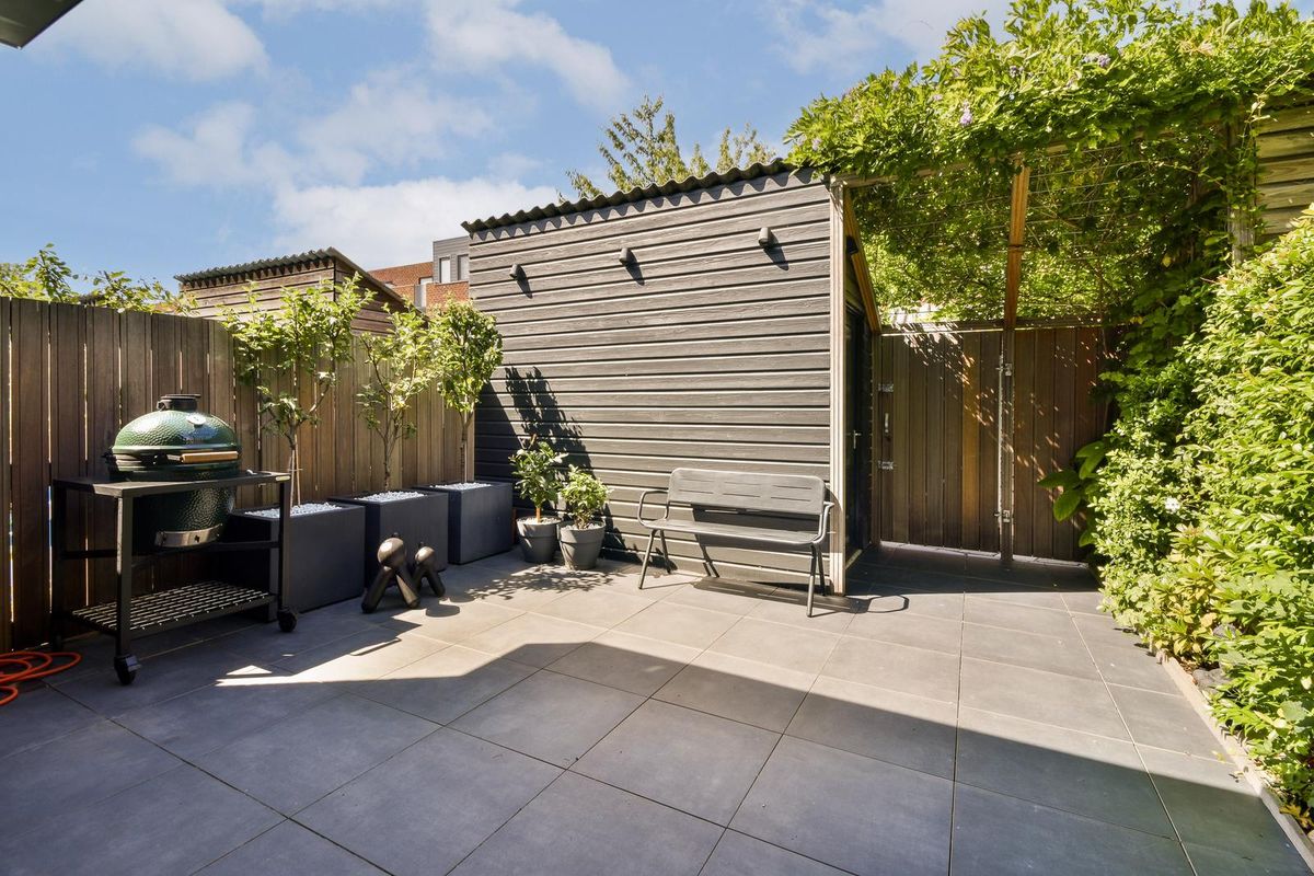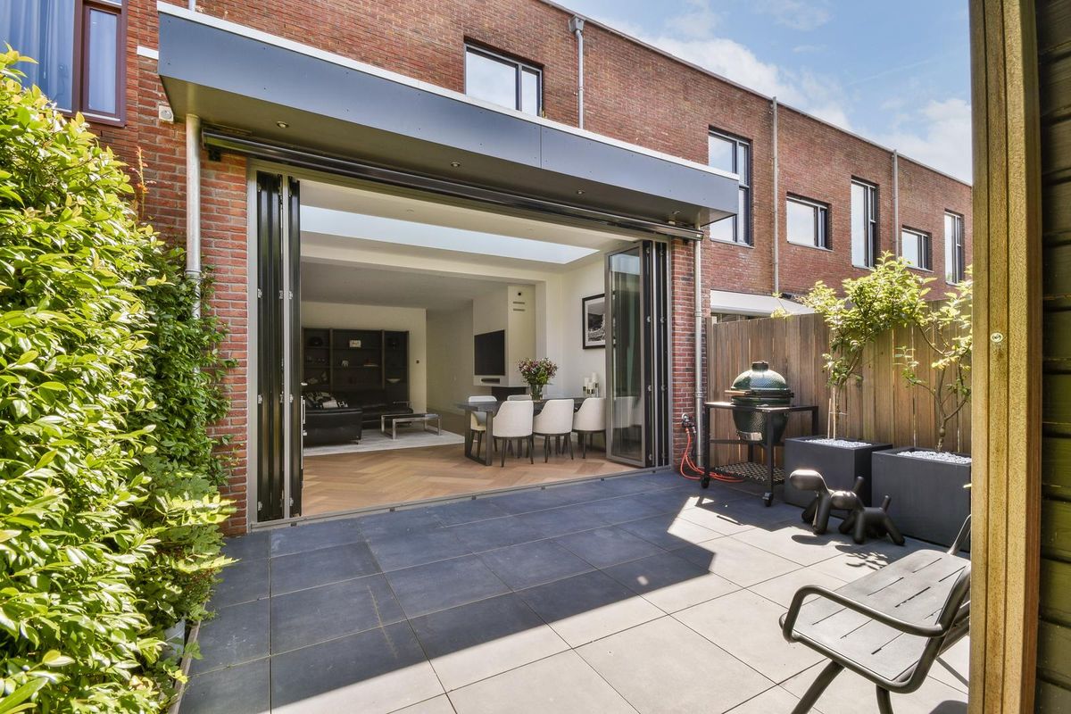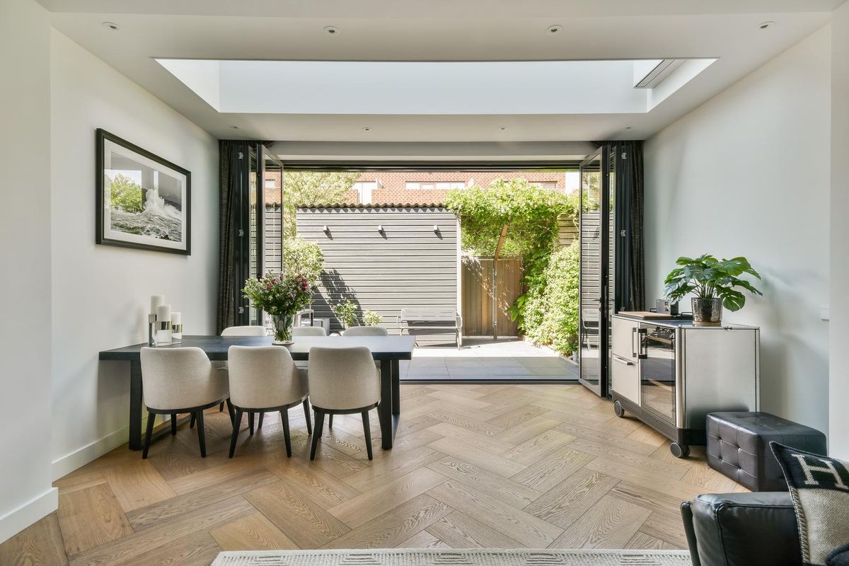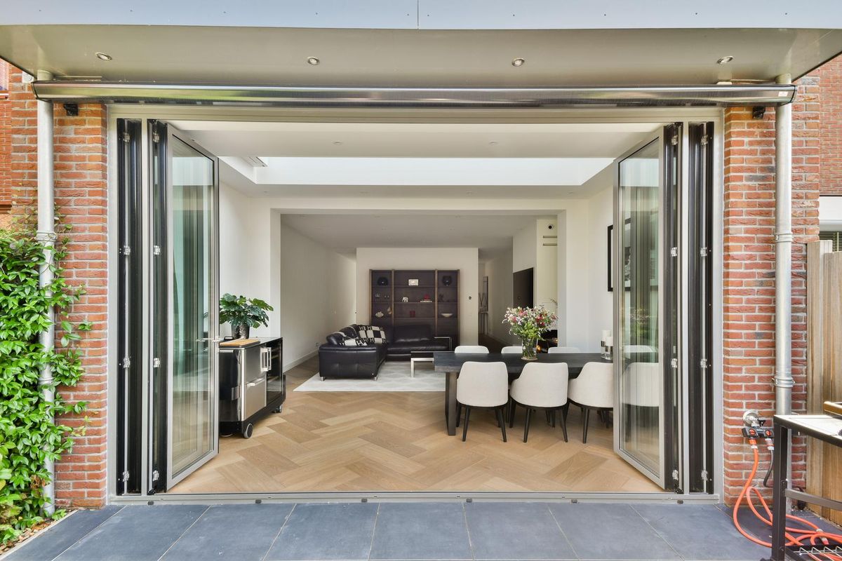 - Aanbouw, harmonicadeuren, bovenraam/lichtstraat in de woonkamer en in de achtertuin voorzien van elektrisch zonnescherm