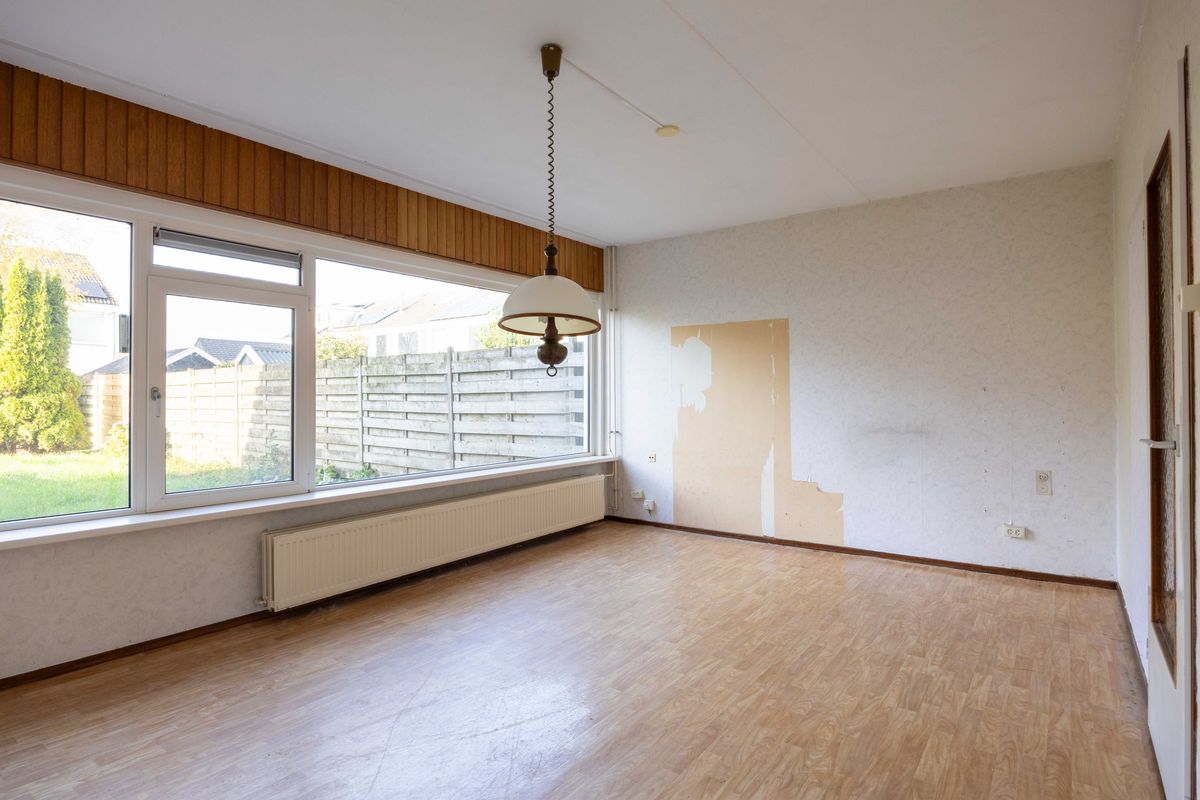 De halfopen keuken bevindt zich aan de zijkant en biedt uitzicht op de voortuin. Hier kun je eventueel een modernere keukenopstelling realiseren of de ruimte uitbreiden tot afgesloten woonkeuken — er is voldoende potentie voor wie graag zelf de handen uit de mouwen steekt.