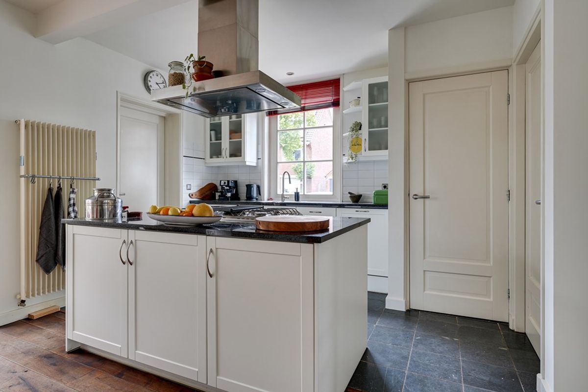De keuken is voorzien van een riant kookeiland, hoogwaardige inbouwapparatuur, een natuurstenen werkblad en lichte kastfronten. De afzuigkap, koelkast en de vaatwasser zijn recent vernieuwd. Via dubbele openslaande deuren heeft u direct toegang tot de zonnige achtertuin. Achter de keuken vindt u de praktische wasruimte met ruime opbergkasten en aansluitend de bijkeuken. Deze ruimte biedt toegang tot zowel de achtertuin als de zijtuin.