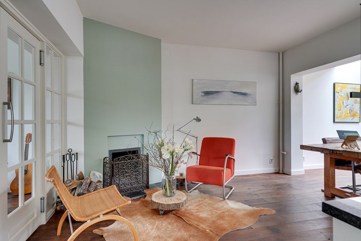 De (TV) kamer aan de voorzijde kenmerkt zich door grote raampartijen, een warme houten vloer en strak gestucte wanden. Met dubbele openslaande deuren treedt u in de woon- eetkamer met royale open keuken en een sfeervolle open haard.