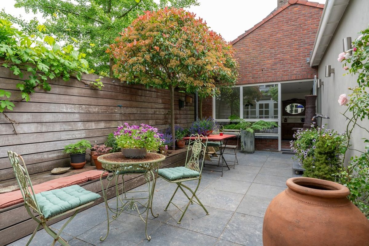 De zonnige en fraai aangelegde patiotuin is bereikbaar via de openslaande deuren vanuit de woon- eetkamer. De tuin biedt volop privacy, is speels ingedeeld met meerdere terrassen en groenborders en leidt naar het multifunctionele verblijf achter op het perceel. Ook de voortuin is verzorgd aangelegd en draagt bij aan de statige uitstraling van deze bijzondere woning.