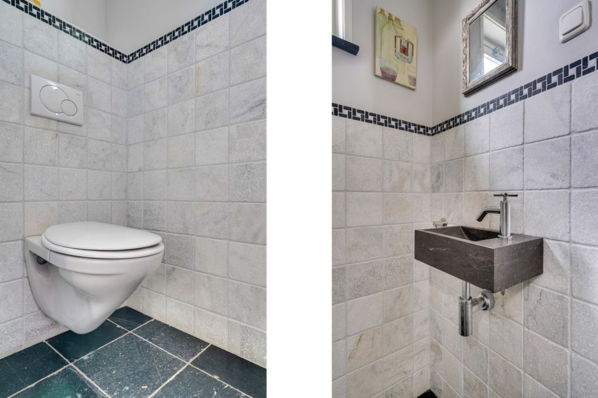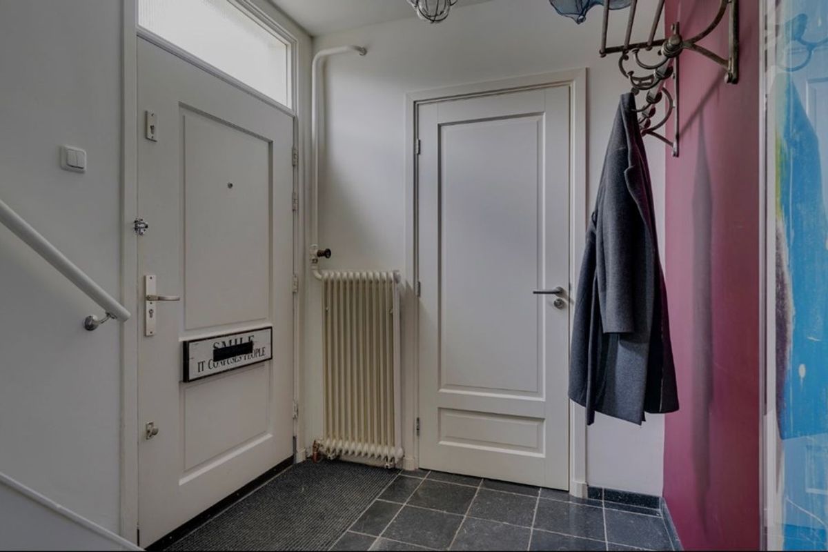 Via de voortuin bereikt u de karakteristieke voordeur van deze statige woning. U stapt binnen in de ruime entreehal met garderobe, trapopgang naar de eerste verdieping en een modern toilet.