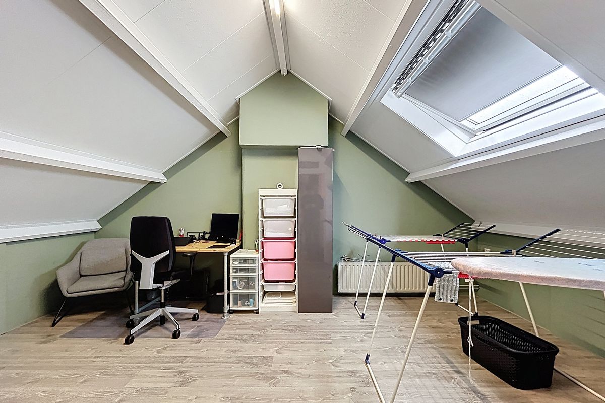 Ook de tweede verdieping is toegankelijk middels de vaste trap. De overloop biedt plaats voor de wasmachine en de CV-ketel (2015). Het dakraam zorgt voor voldoende licht hier. Tenslotte treffen we de vierde slaapkamer van het huis. Deze is uiteraard ruim genoeg en geheel voorzien van inbouwkasten onder de schuine kap. Ook hier zorgt het grote raam voor voldoende lichtinval en de dakisolatie maakt de ruimte aangenaam.