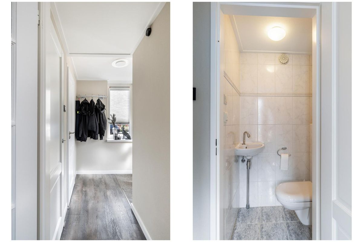 Hal/entree met de meterkast (11 groepen, 3 aardlekschakelaars en slimme meters), geheel betegeld hangtoilet met fontein en toegang tot de woonkamer. De pvc-vloer is doorgelegd tot in de keuken.