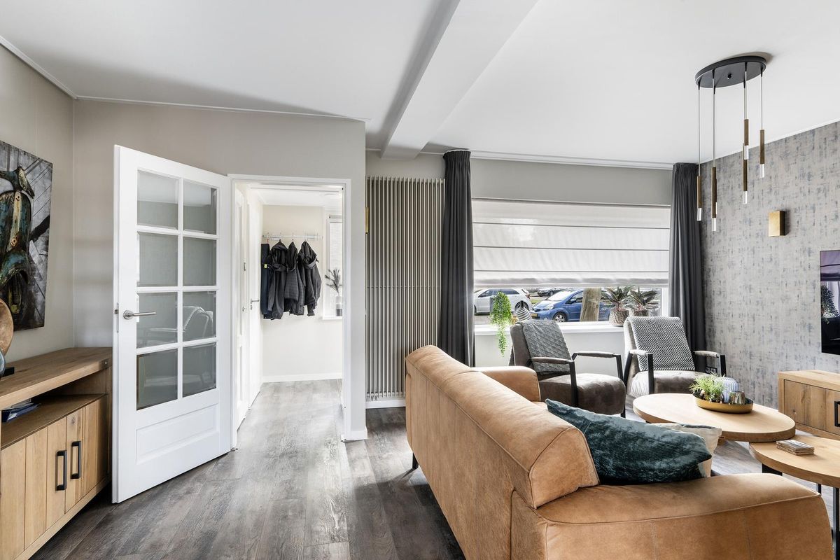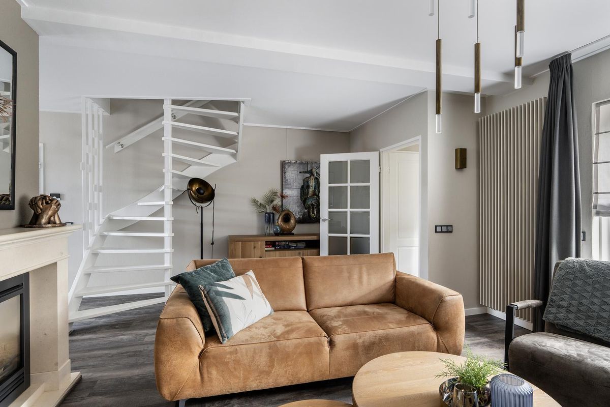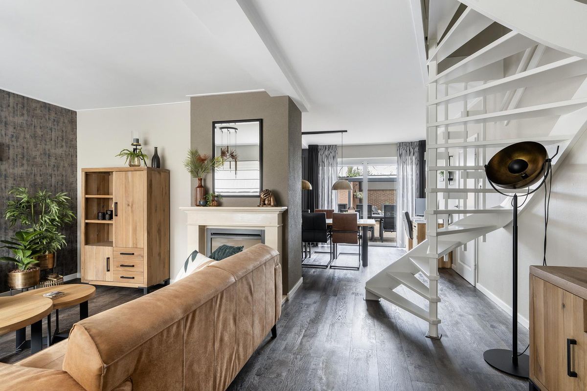 Riante living met een sfeervolle gashaard, trapopgang en een doorloop naar de open keuken aan de achterzijde.