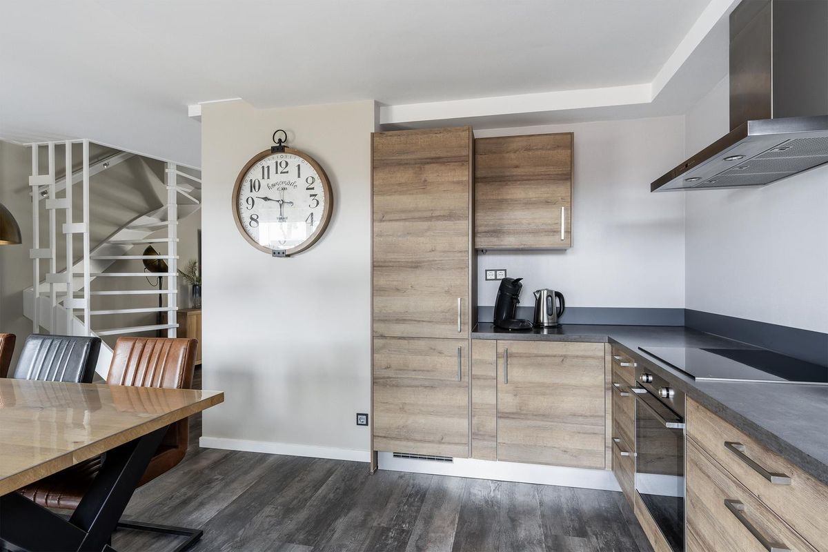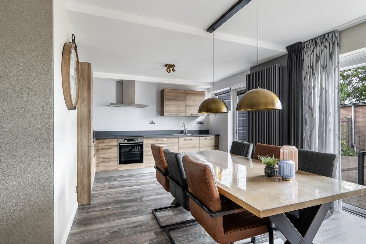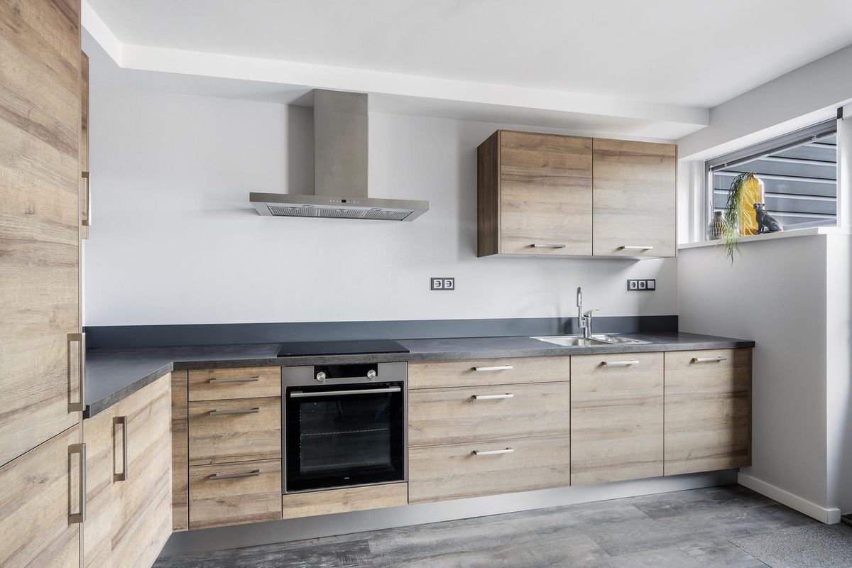 Moderne keuken in hoekopstelling met een 4-groeps inductiekookplaat, afzuigkap, oven, vaatwasser, spoelbak en een koel-vriescombinatie. Ook is er vanuit de keuken toegang tot de bijkeuken en de achtertuin.