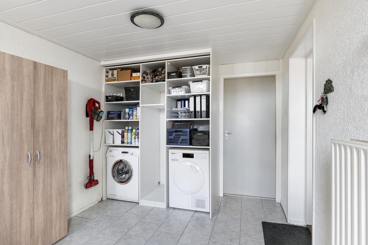 Praktische witgoedruimte met de opstelplaats voor wasmachine en droger en een deur naar de garage en de tuin.