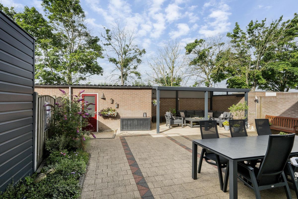 De achtertuin is gelegen op het zuidwesten en is voorzien van sierbestrating, plantenborder, een elektrisch valzonnescherm, achterom, aluminium overkapping en een stenen berging met elektra.
