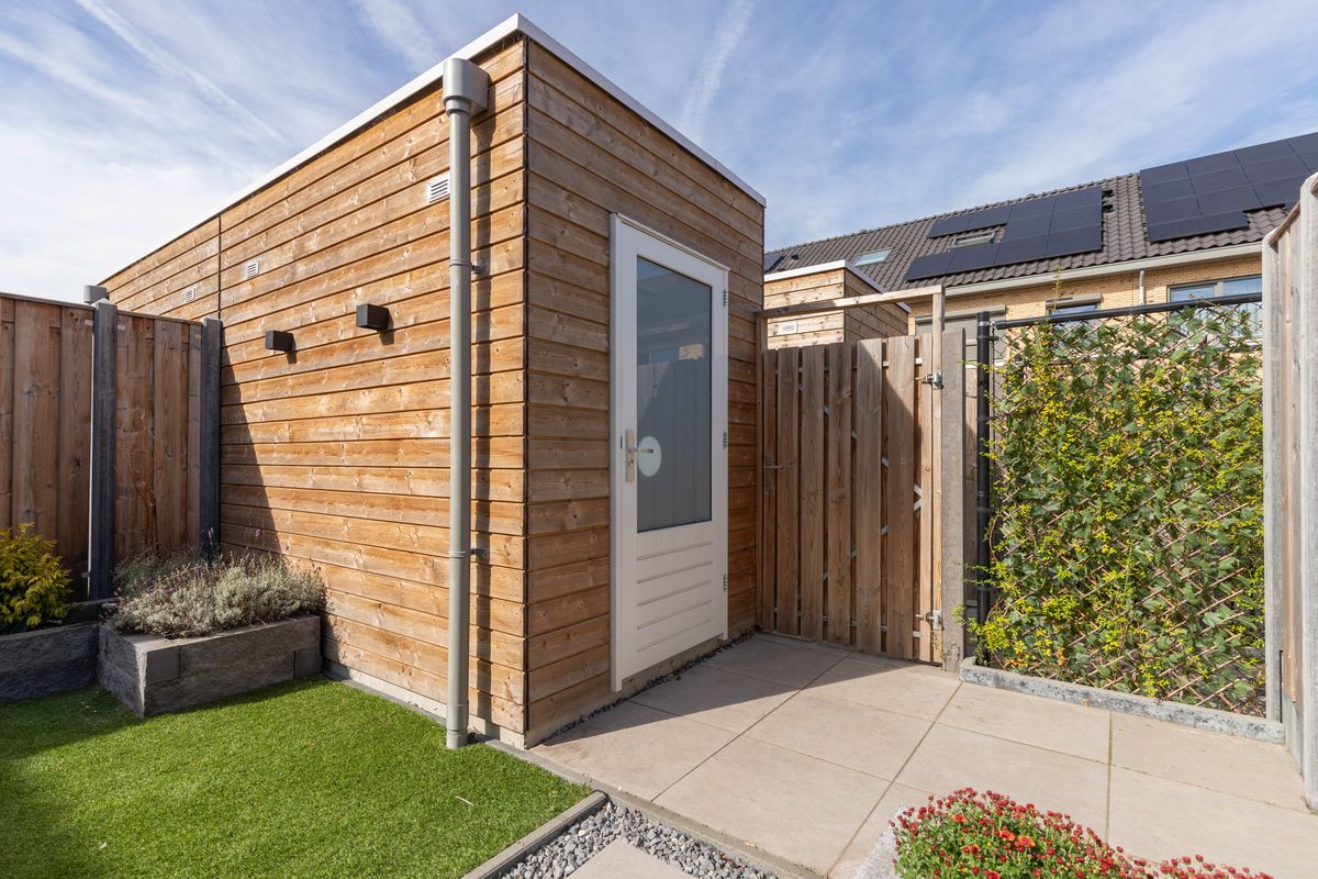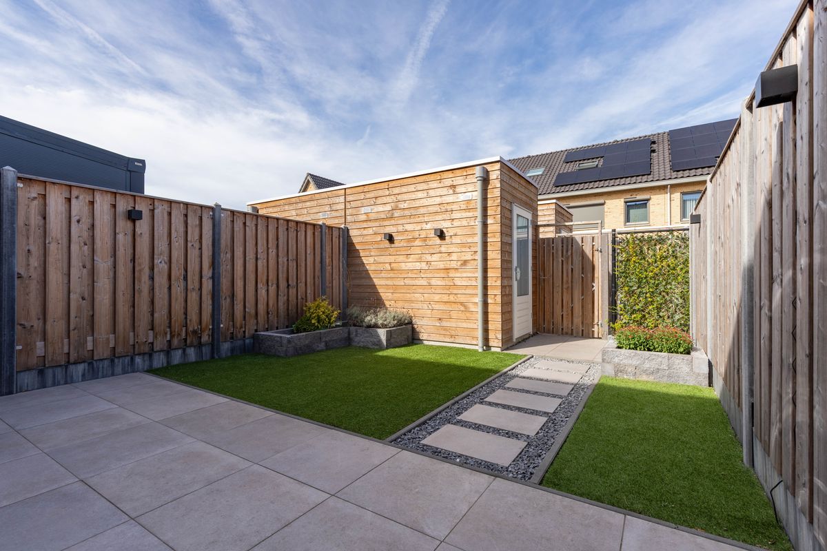 De achtertuin is zonnig en praktisch ingedeeld, met voldoende ruimte voor een terras en speelgelegenheid. Dankzij de gunstige ligging geniet u hier vrijwel de hele dag van de zon. Achterin de tuin staat een vrijstaande houten berging (ca. 5 m²), ideaal voor fietsen en tuingereedschap. Een achterom maakt de tuin extra praktisch in gebruik.