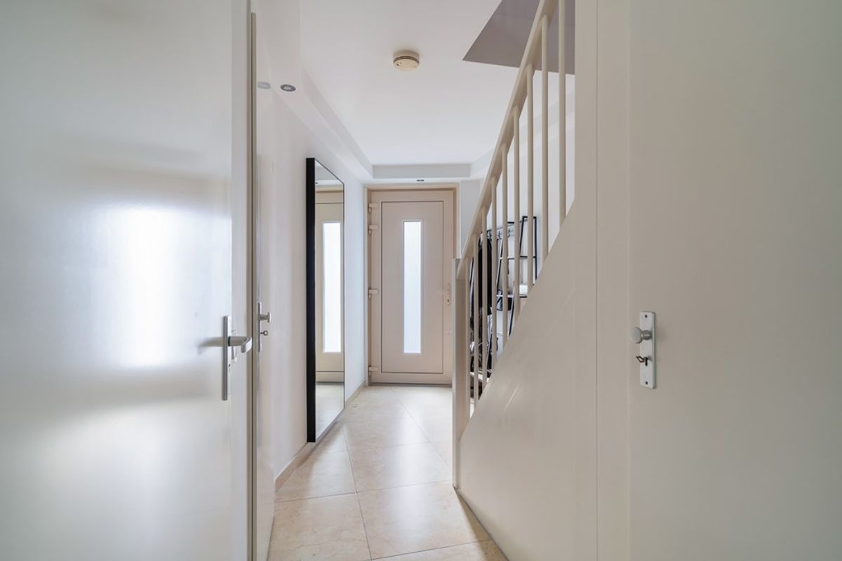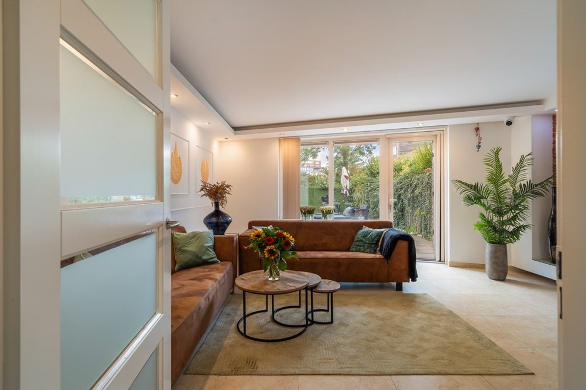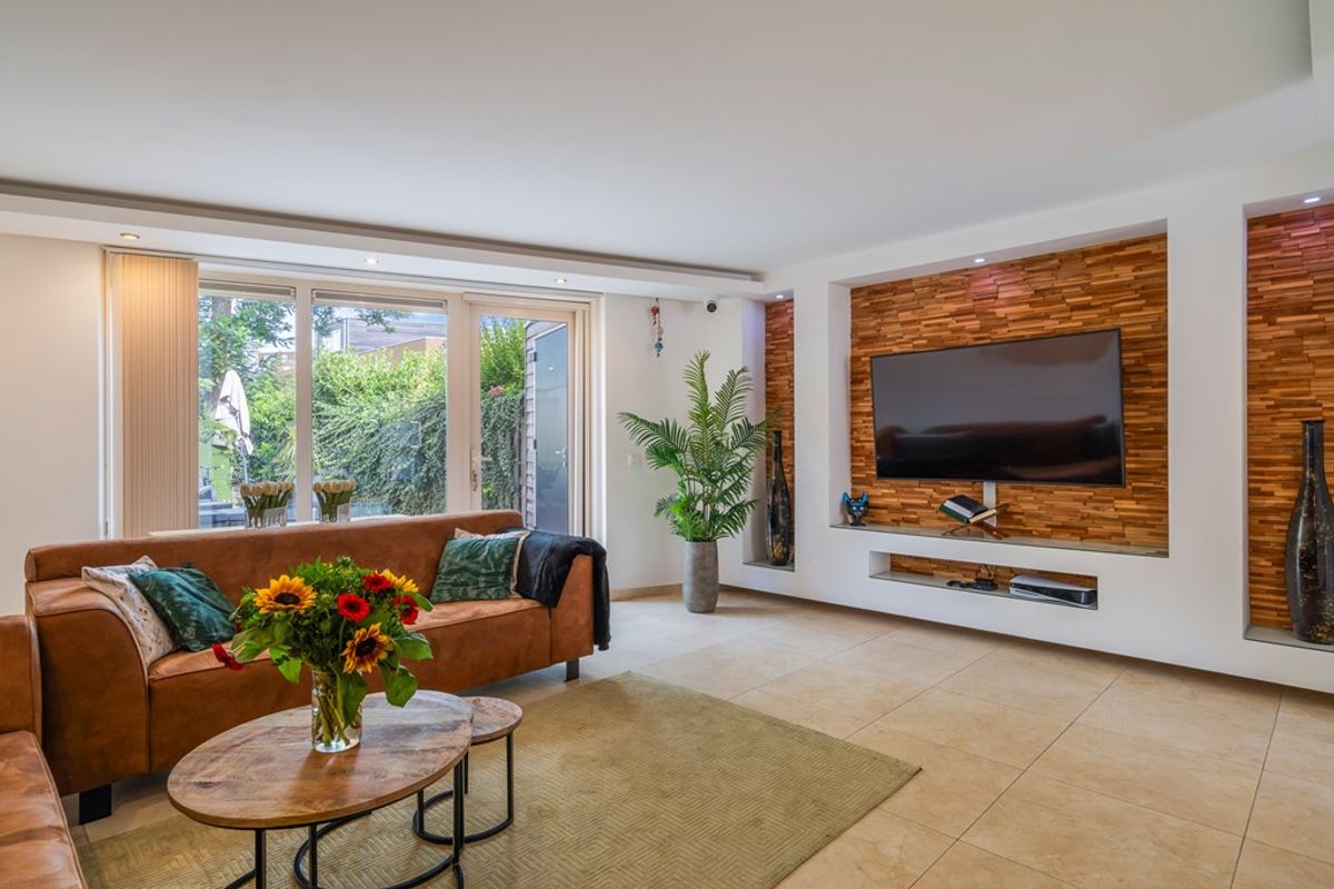 Bij binnenkomst word je meteen verrast door de lichte hal en de nette afwerking. Vanuit hier stap je de royale woonkamer in, een sfeervolle ruimte met strak gestucte wanden en plafond, grote vloertegels en comfortabele vloerverwarming. De speelse indeling geeft de ruimte karakter, terwijl de grote ramen en openslaande deuren zorgen voor een zee aan daglicht. De tuin ligt er uitnodigend bij – perfect voor een ochtendkoffie of lange zomeravond.